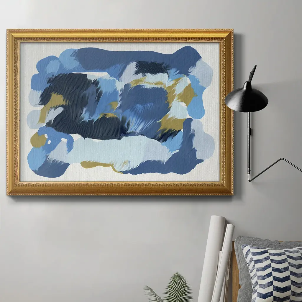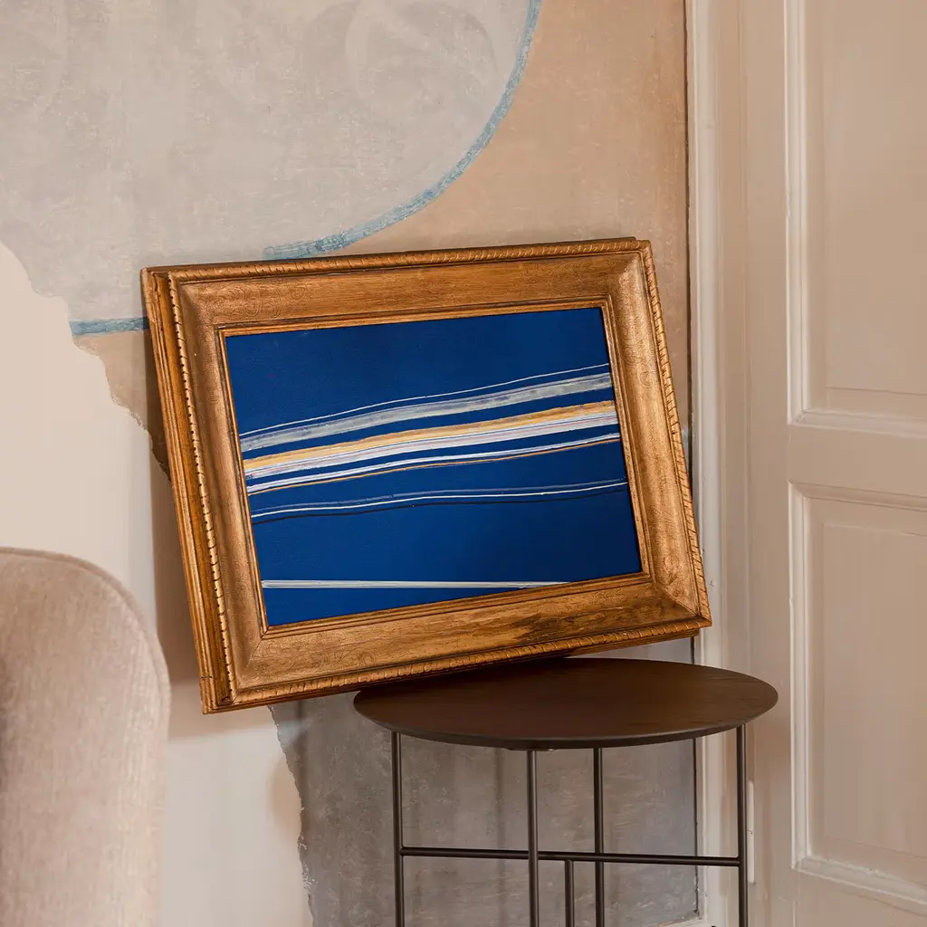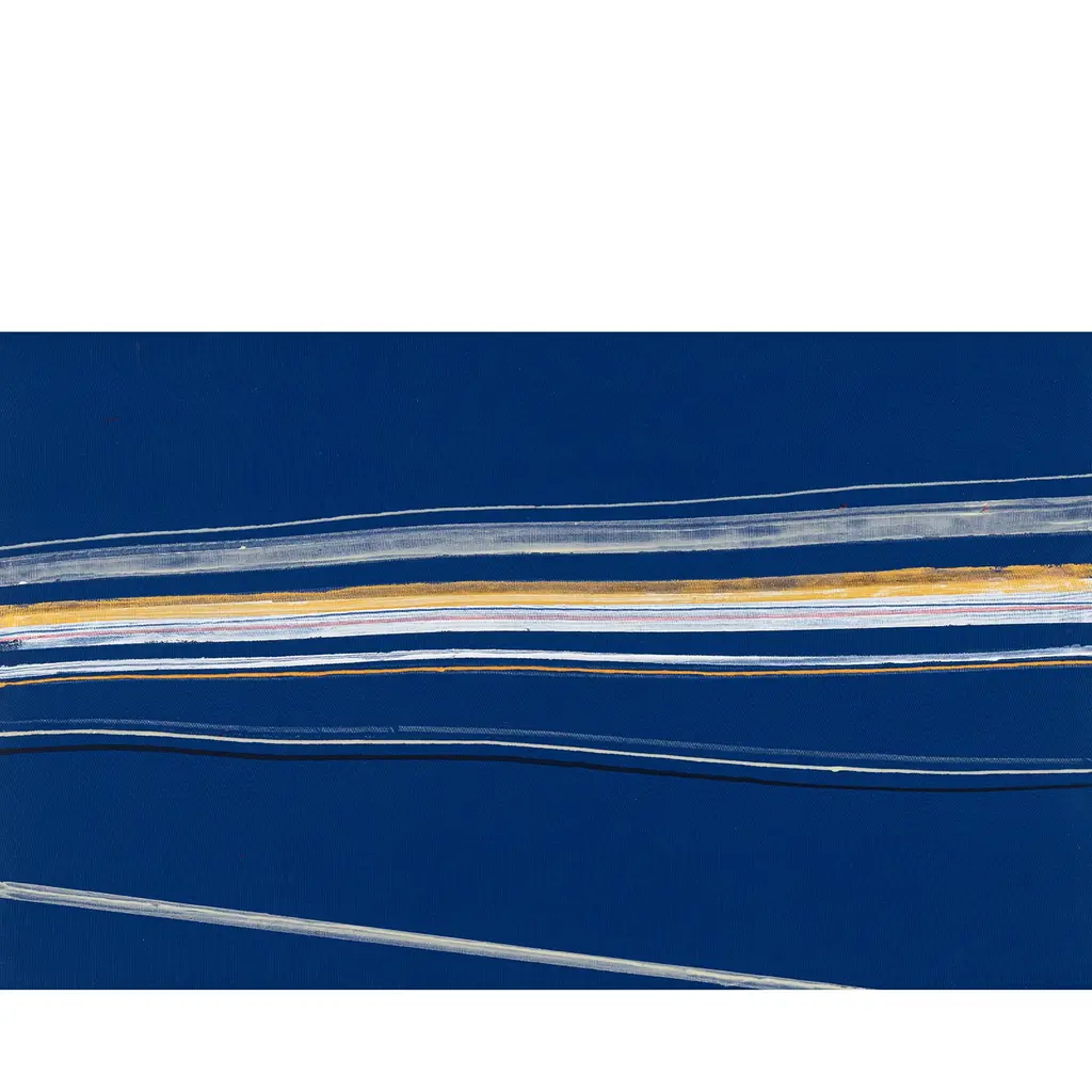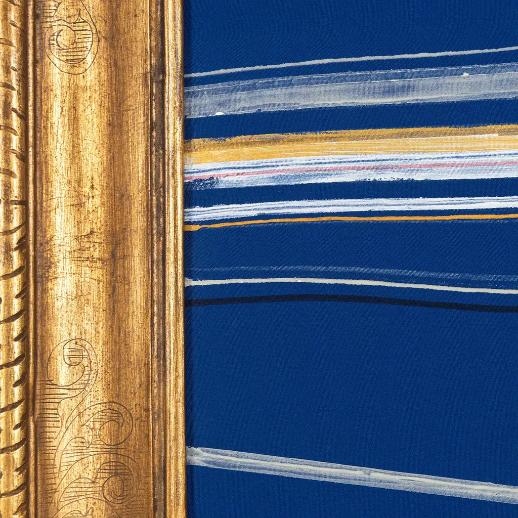 A striking statement piece that will elevate any modern interior with unparalleled sophistication, this acrylic painting is part of a 2020 series using Lumen. Inspired by the natural world the painting boasts vibrant horizontal lines irrupting calm blue background. Enclosed in a golden colored frame, the piece measures 26,5 x 51cm (without frame). Among this artist’s talents are an elegance and a smiling vagueness that represent a type of aristocratic detachment from his museography culture itself and from the rhetoric abstractions of informal research.