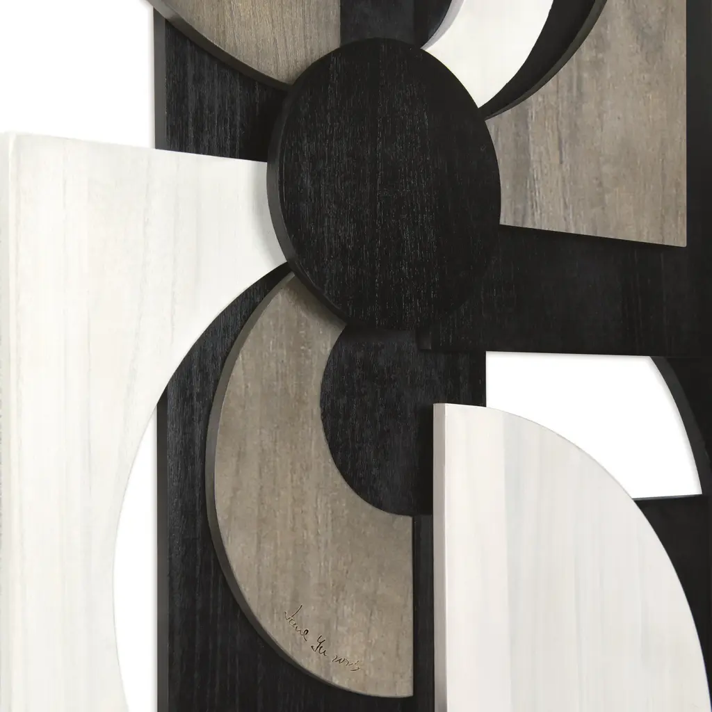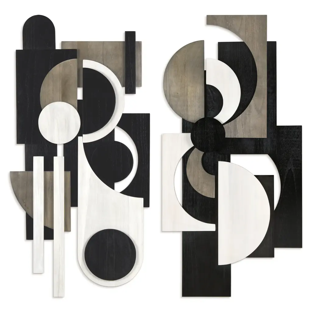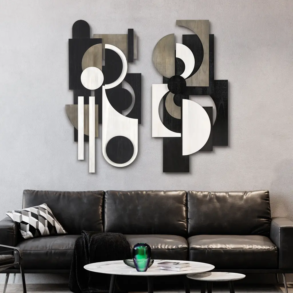 Diptych Set - This stunning rectangular abstract wall sculpture set is a masterpiece, crafted from the finest solid paulownia wood and imbued with a sense of passion and romance. The wood pieces are arranged in a mosaic-like pattern, each one carefully chosen for its unique shape and color, mixing alabaster, ebony and charcoal gray to add depth and nuance to each sculpture, creating a sense of mystery and intrigue, as the artist Jane Yu intended before laser engraving her signature on it. This diptych is a true work of art, one that is sure to capture the heart of the beholder, whether is hunged horizontally or vertically. Please note that since these abstracts are made from real solid wood, the colors and patterns will be unique in each sculpture. Therefore, the image shown may be slightly different from the actual artwork.