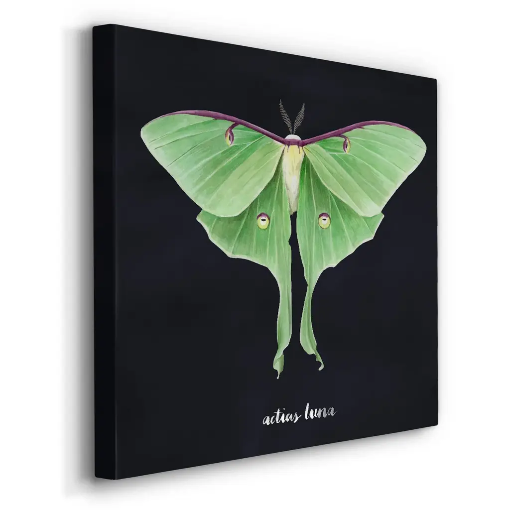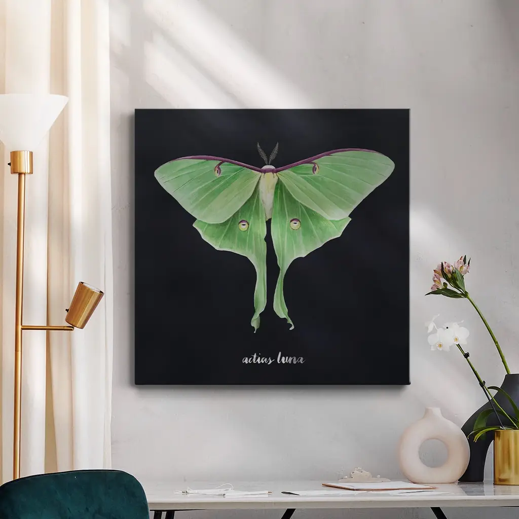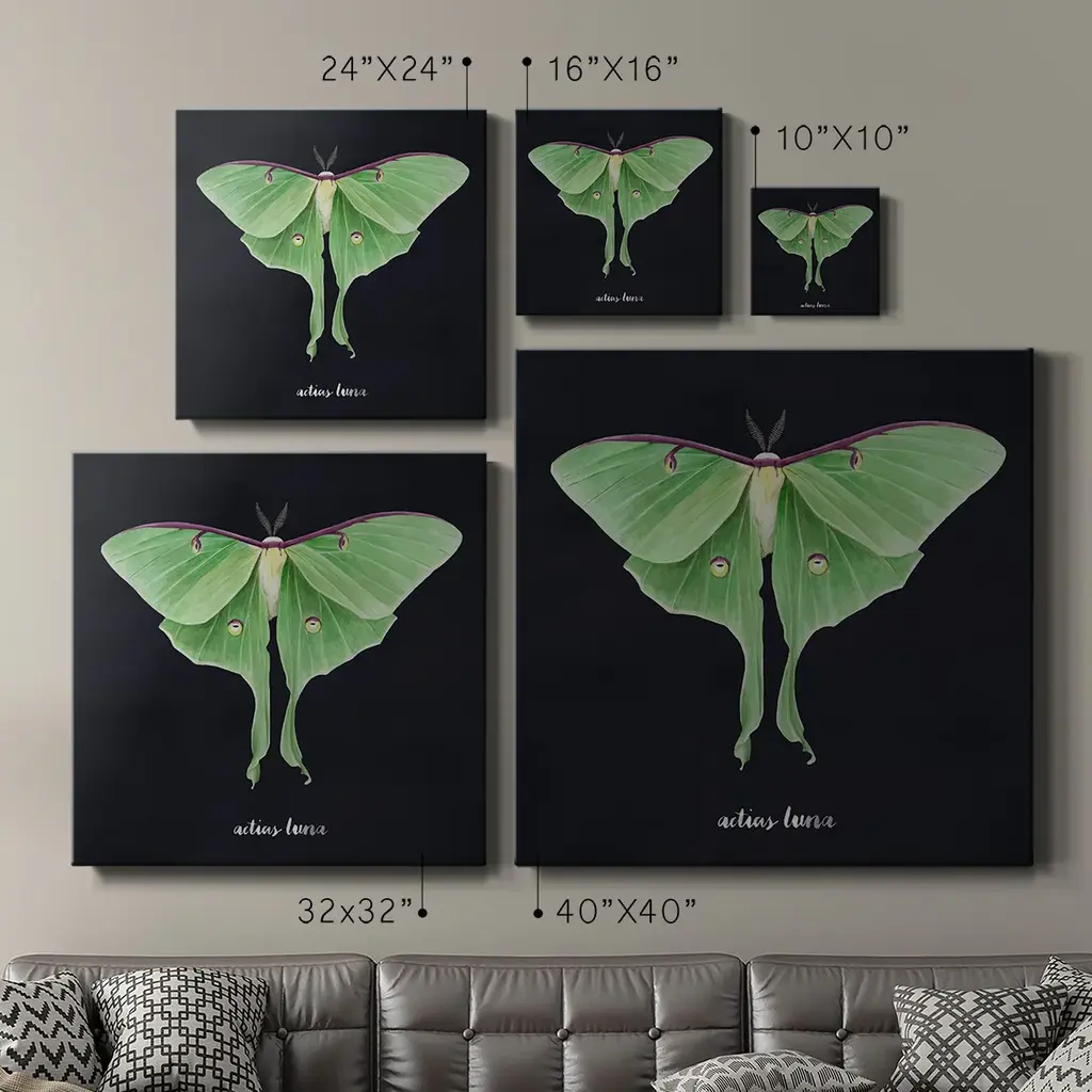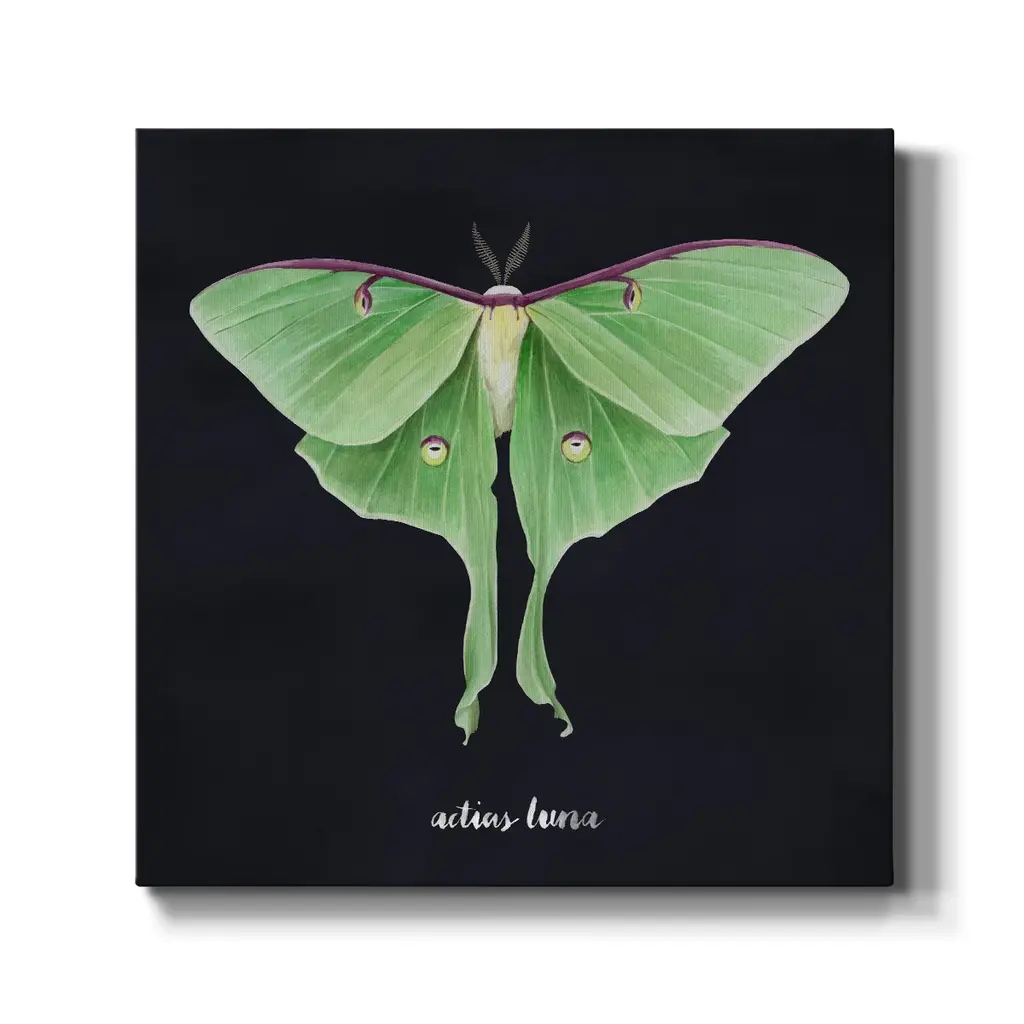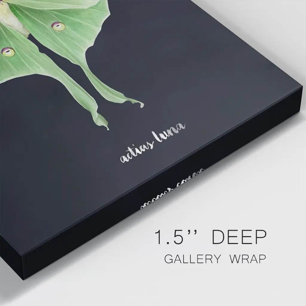 Luna Moth II-Premium Gallery Wrapped Canvas - Ready to Hang A premium hand stretched gallery wrapped canvas print created to last. Featuring a beveled a solid wood stretcher bar, each piece comes ready to hand 5 SIZES AVAILABLE 10''X10'' - Overall Size 16''x16'' - Overall Size 24''x24'' - Overall Size 32''x32'' - Overall Size 40''x40'' - Overall Size Each piece is made to order. Built to Last Each piece comes ready to hang Solid wood stretcher Fade and Water resistant Made domestically