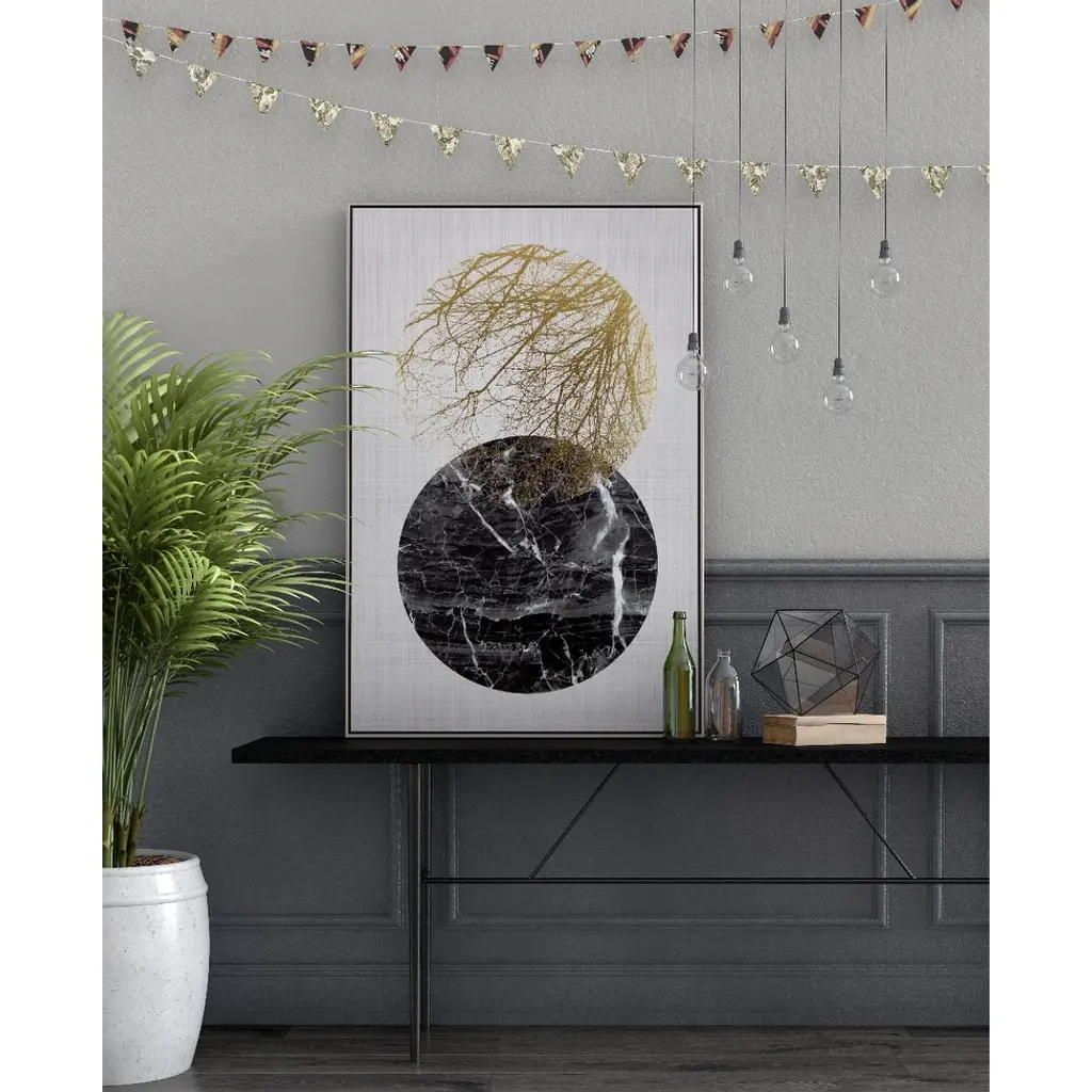 A great addition to any modern space. This large minimalist print features gold foil accents reminiscent of the sun and the moon, finished in a black and silver floater frame