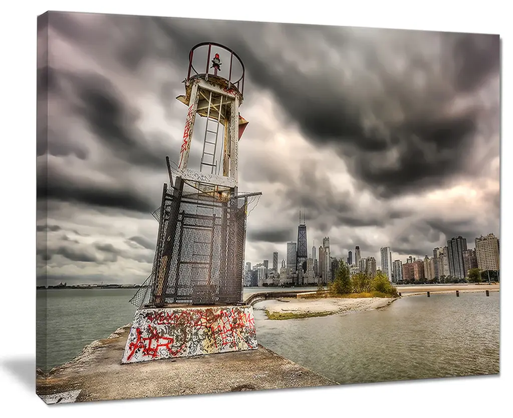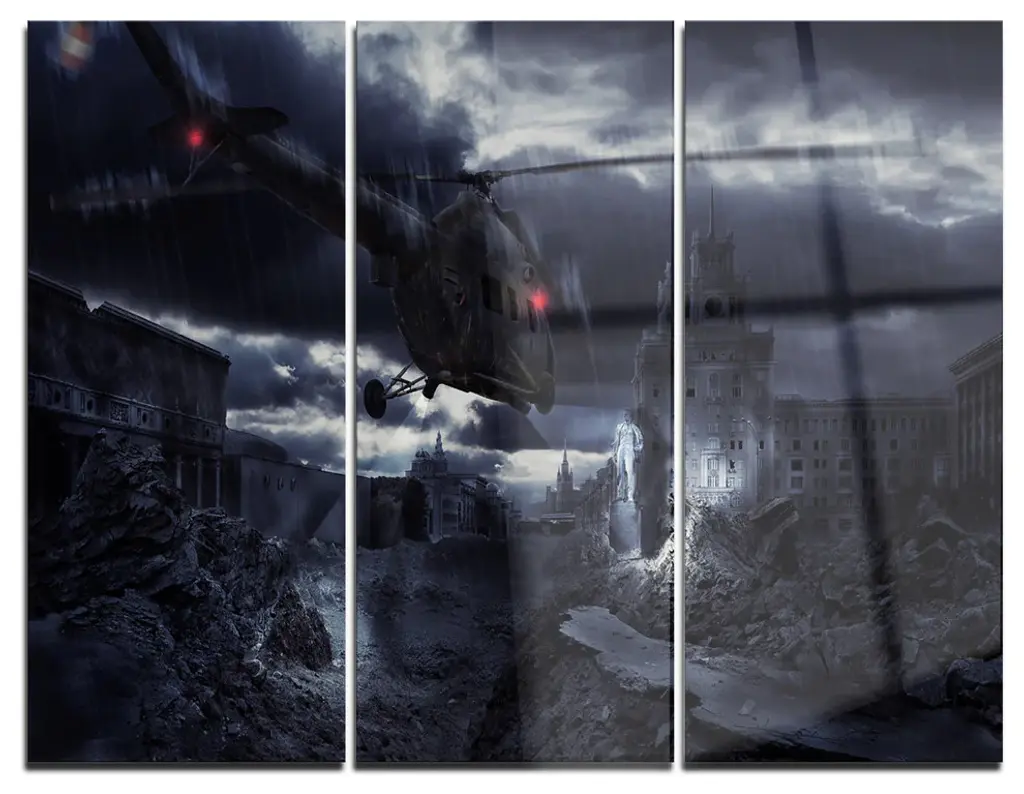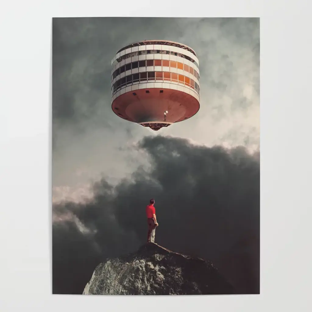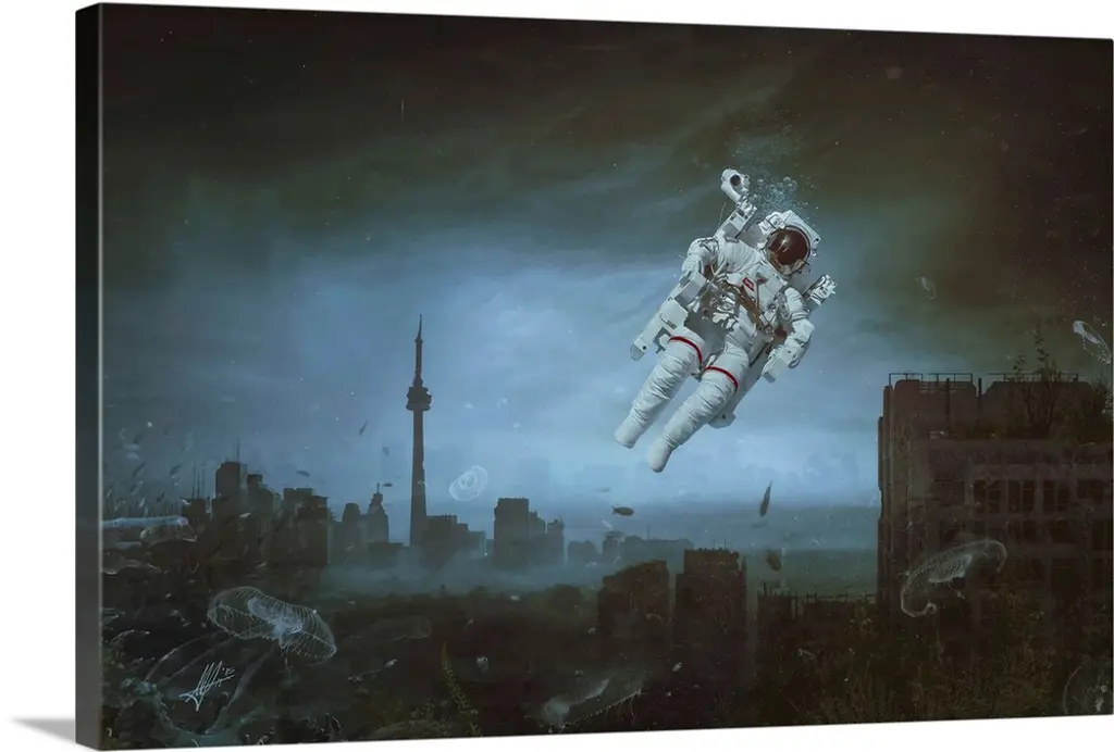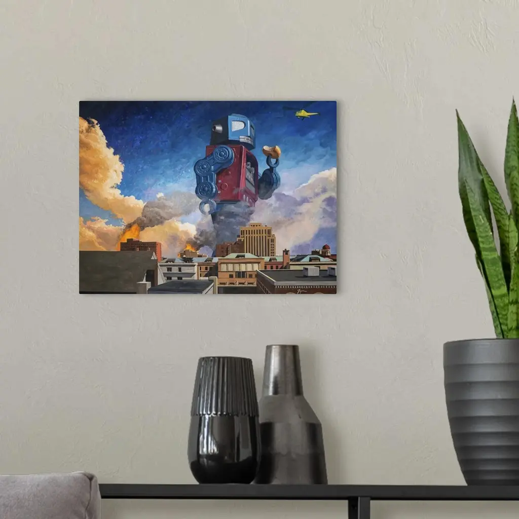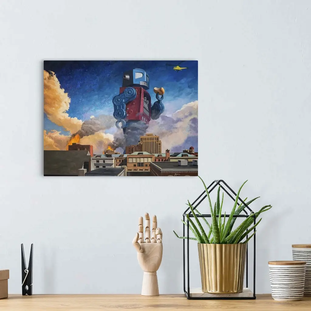 A contemporary painting of a giant retro toy robot eating a donut and walking through a burning city.