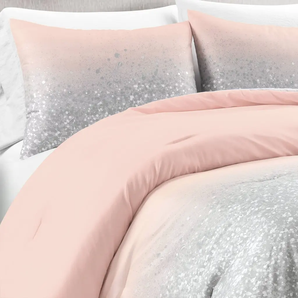 Give your child or teen's bedroom a glamorous makeover with this glitter comforter set. The sparkly glitter design fades into a bright and beautiful comforter color for a very trendy look. Your child will love the printed sparkles and ombre style.You can never go wrong with glitter! This quilt set is the perfect way to add a glamorous touch to your child's bedroom. The glitter ombre drips into a stylish fun color is super on trend and a great way to introduce a pop of color. The blend of patterns will seamlessly complement the bedroom's existing decor. Twin is a two piece set includes one quilt and one matching sham. Full/Queen is a three piece set includes one quilt and two matching shams. This set is machine washable for your convenience. Please refer to label for full care instructions.Features:Twin Measures:Full/Queen Measures: