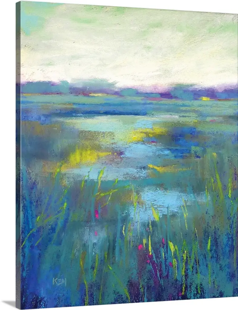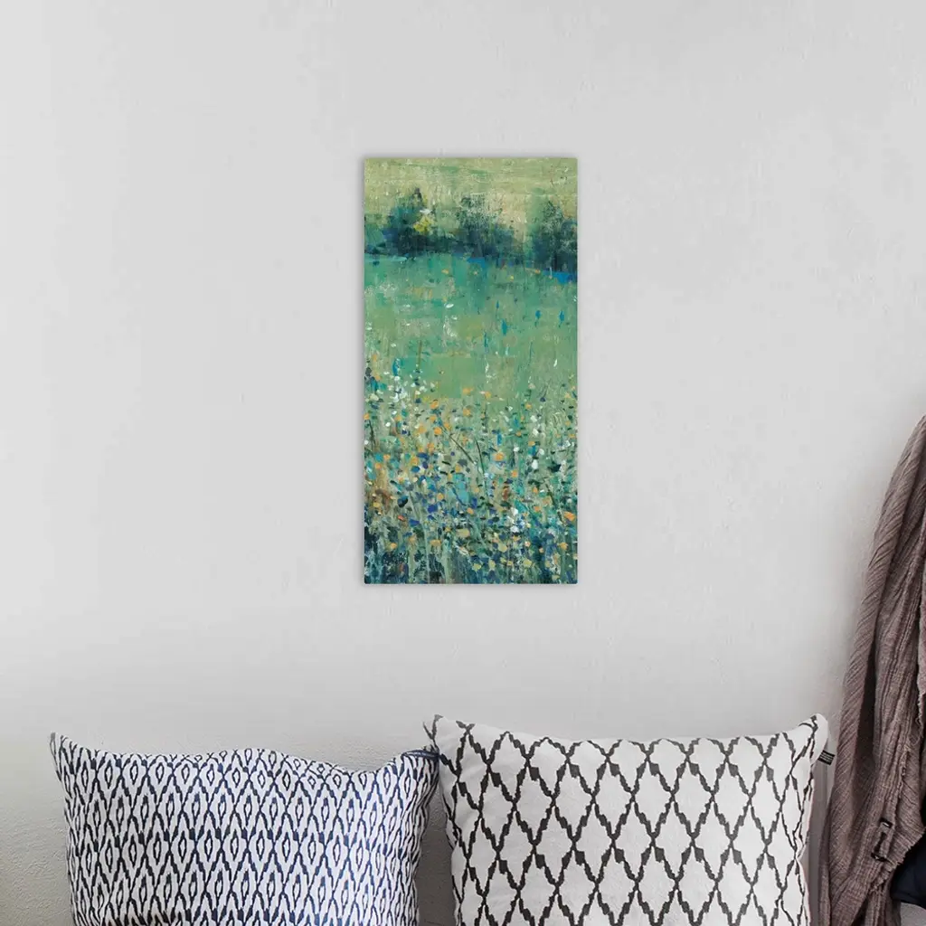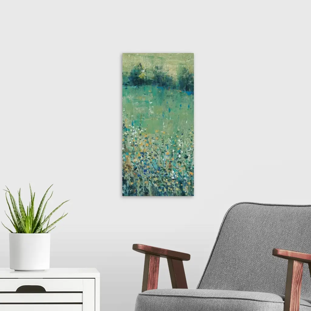 Contemporary painting of an abstracted green meadow full of wildflowers.