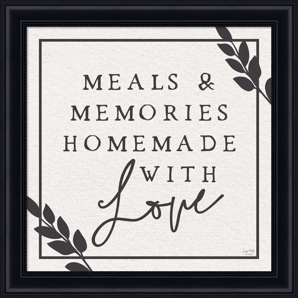 Meals & Memories Made with Love by Lux + Me Designs is a high quality piece of framed artwork. The finished size of this piece is 16.5" X 16.5". It has a Black Petite Decorative frame and is finished with high quality Acrylic Plexiglass. 100% Satisfaction Guaranteed.