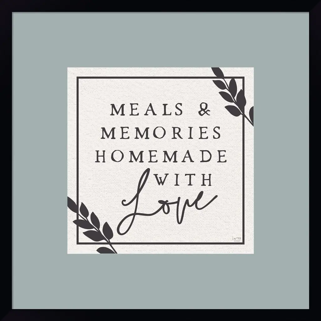 Meals & Memories Made with Love by Lux + Me Designs is a high quality piece of framed artwork. The finished size of this piece is 20" X 20". It has a Petite Black with Flat Front frame, is single matted and finished with high quality Acrylic Plexiglass. 100% Satisfaction Guaranteed.