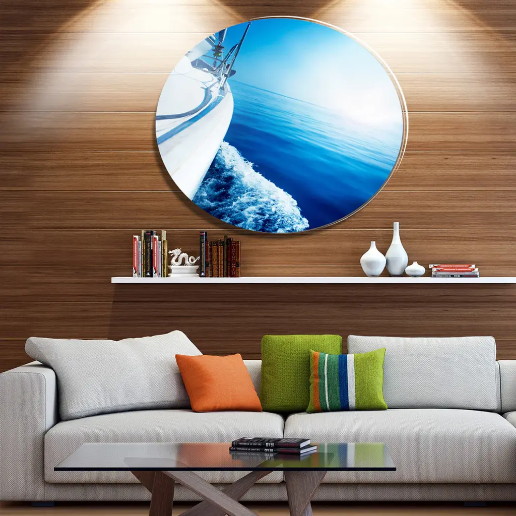 Luxury Yacht Sailing In Blue Sea, Seashore Round Metal Wall Art, 38"