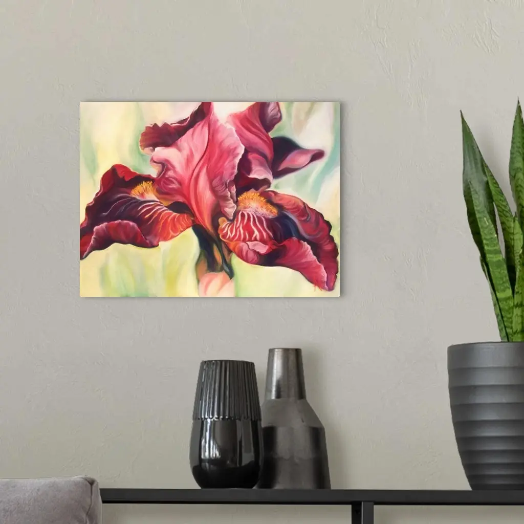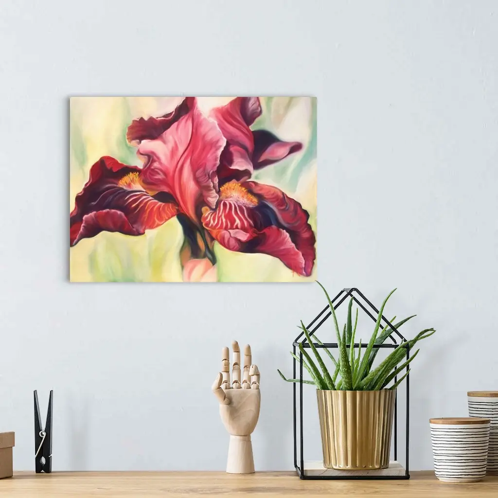 Madame is a big flower painting if a burgundy wine-colored bearded iris sitting on a bright pale-yellow green background brings a touch of sophistication on to a room.