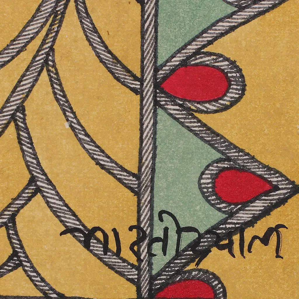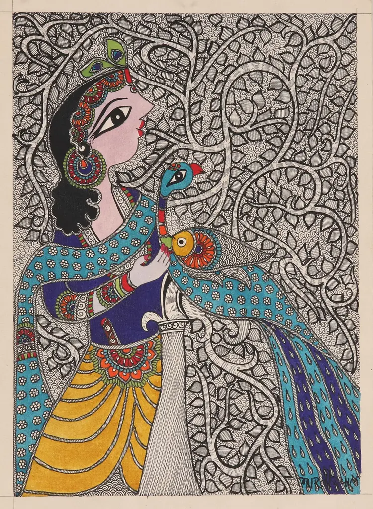 Immerse yourself in the captivating world of Indian artistry through Bharti Dayal's stunning depiction of Hindu deities Krishna and Radha, symbolizing divine love and unity. Executed in the vibrant Madhubani style with acrylic paints and vegetable dyes on handmade paper, this artwork promises to mesmerize with its rich colors and cultural significance.