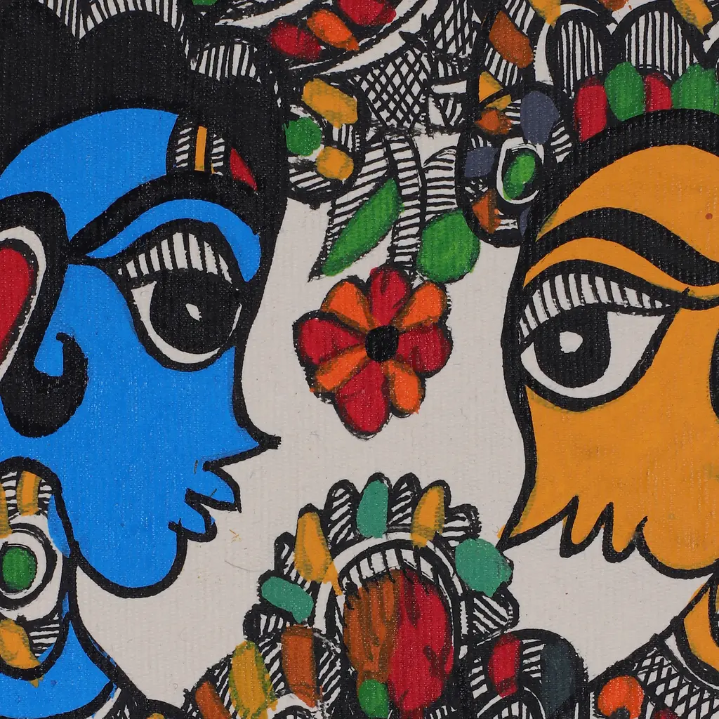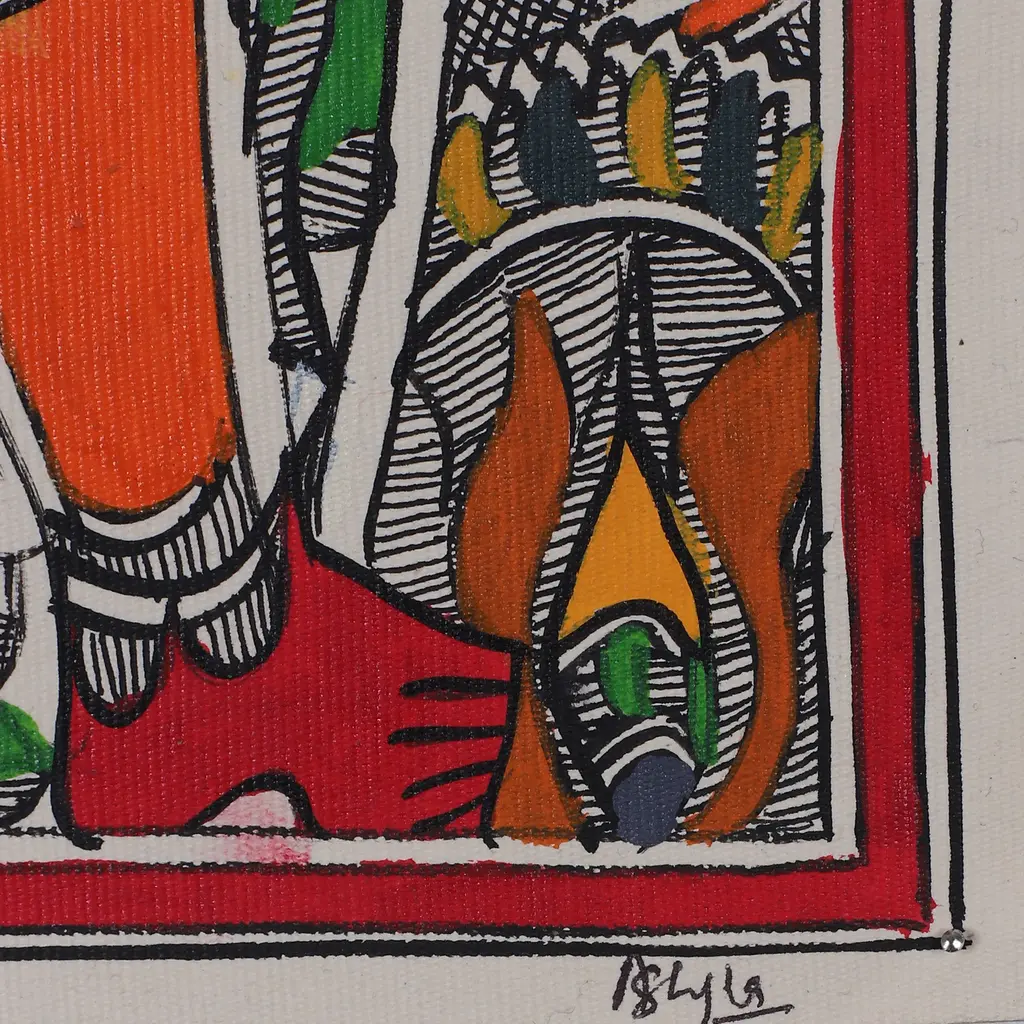 Devendra Kumar Jha is a master of Madhubani art and often depicts the captivating tales of Hindu mythology in his paintings. In this exceptional scene crafted with natural dyes on handmade paper he portrays the wedding between the goddess Sita and Ram, the avatar of the god Vishnu, who are the protagonists of the epic Ramayana. They wear vibrant attire and impressive jewelry while tenderly looking into each other's eyes in this colorful artwork filled with cultural significance.