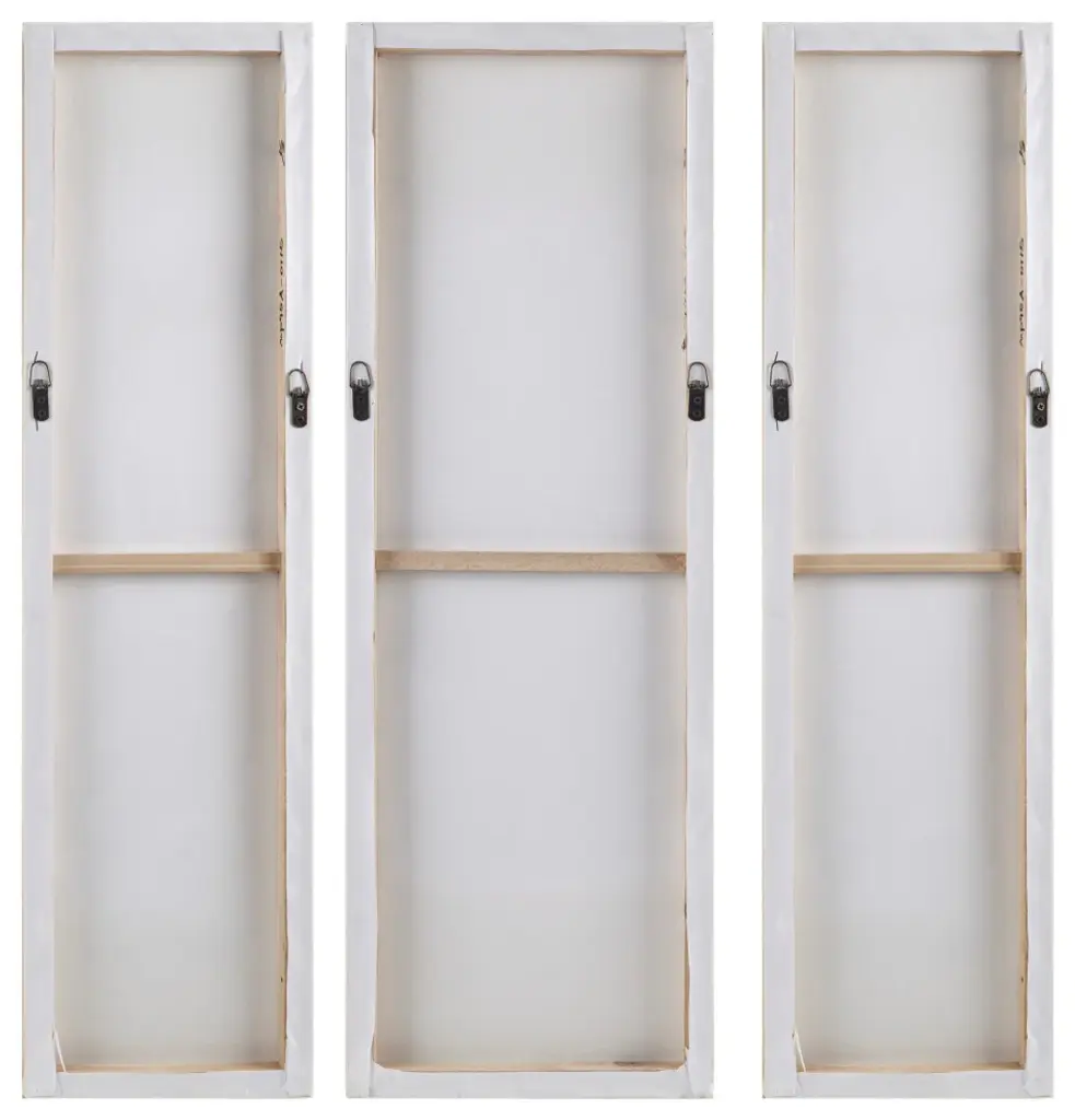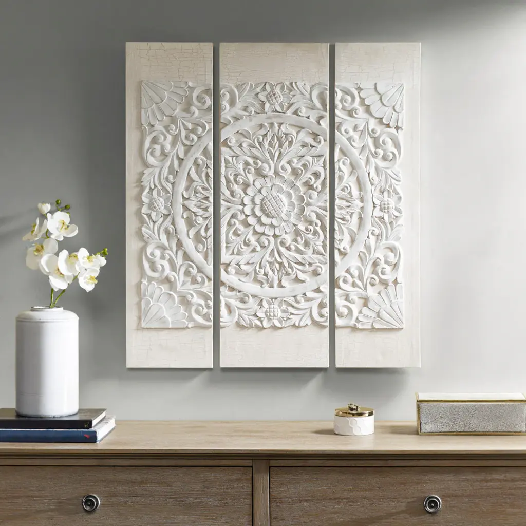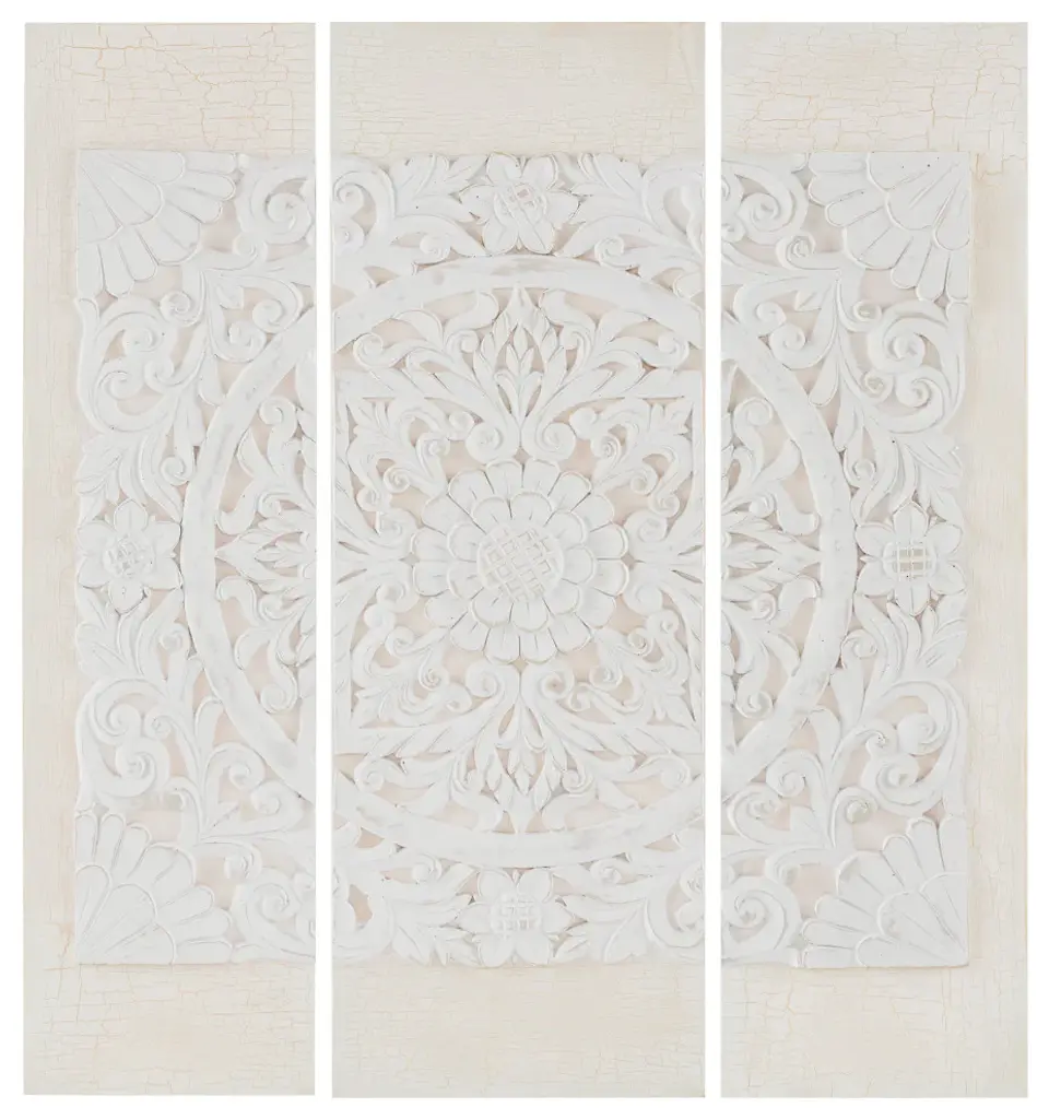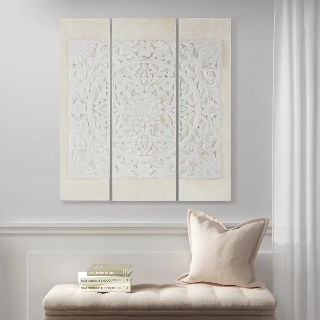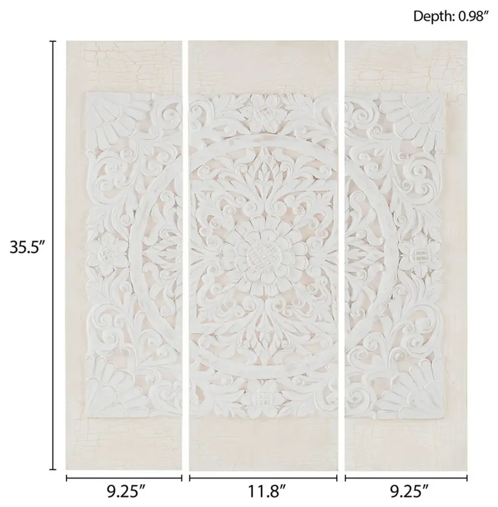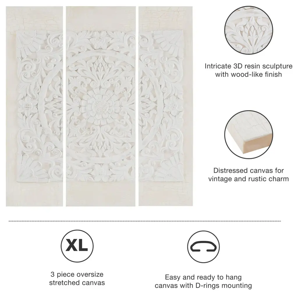 Hang our Madison Park Mandala Triptych 3-piece Dimensional Resin Canvas Wall Art Set on your wall to create a unique focal point in your space. An intricate carving design with the look and feel of wood is made from durable resin, then attached to the embellished canvas and set among each piece of this 3PC wall decor. The embellished canvas is featured in an off white washed tone and purposefully distressed, adding a rustic charm to the look. Globally inspired, this alternative wall decor adds a stunning texture and unique boho touch to any room in your home.Size :1 Center Piece:11.8"W x 35.5"H x 0.98"D2 Side Pieces:9.25"W x 35.5"H x 0.98"D (2)Material:Canvas: 50%Resin: 45%Wood: 5%Features:A set of 3 with center piece measuring 11.8" W x 35.5"H and side pieces measuring 9.25"W x 35.5"HTriptych wall decor set with a carved medallionDistressed crackle finish canvas background gives an aged lookD-ring hangers to hang vertically Indoor use only. Spot clean only