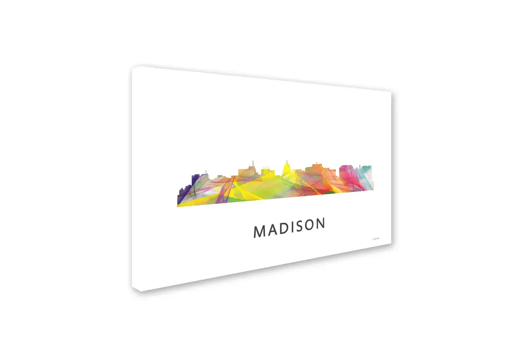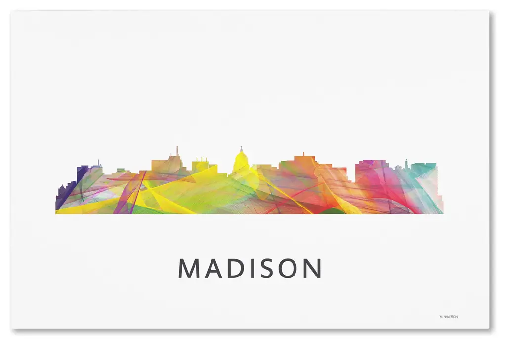 Artist: Marlene WatsonSubject: LandscapeStyle: ContemporaryProduct Type: Gallery-Wrapped Canvas ArtMade in USAThis ready to hang, gallery-wrapped art piece features a multicolored image of the Madison, Wisconsin skyline.Born in Scotland and now residing in Hong Kong, Marlene Watson has been painting her way through life. She paints things she notices in everyday life and brings out her positive energy through her work. Marlene has gallery showings and has also illustrated a children's book. She cares for 12 cats and works toward animal conservation and rescues with her art.Giclee (jee-clay) is an advanced printmaking process for creating high quality fine art reproductions. The attainable excellence that Giclee printmaking affords makes the reproduction virtually indistinguishable from the original piece. The result is wide acceptance of Giclee by galleries, museums, and private collectors. Gallery wrap is a method of stretching an artist's canvas so that the canvas wraps around the sides and is secured a hidden, wooden frame. This method of stretching and preparing a canvas allows for a frameless presentation of the finished painting.
