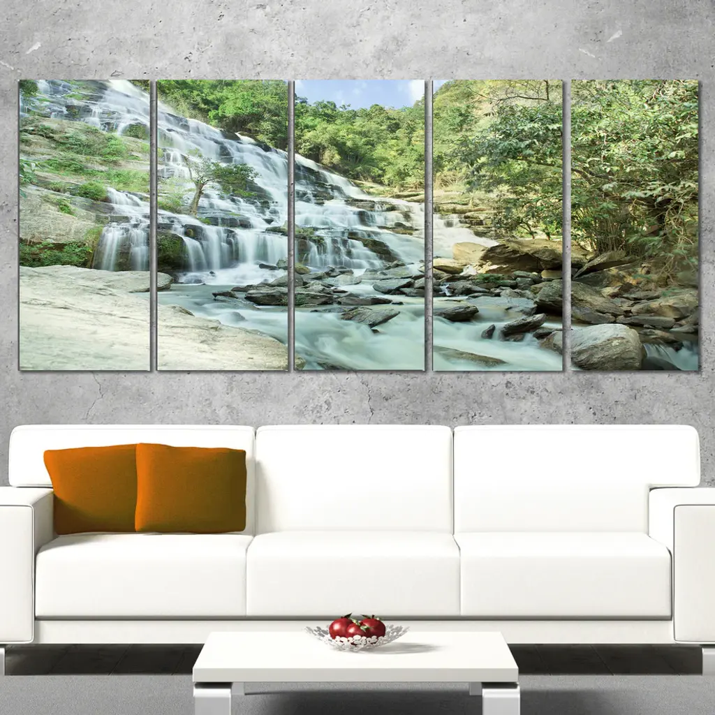 "Maeyar Waterfall In Rain" Landscape Canvas Photo Print, 5 Panels, 60"x28"