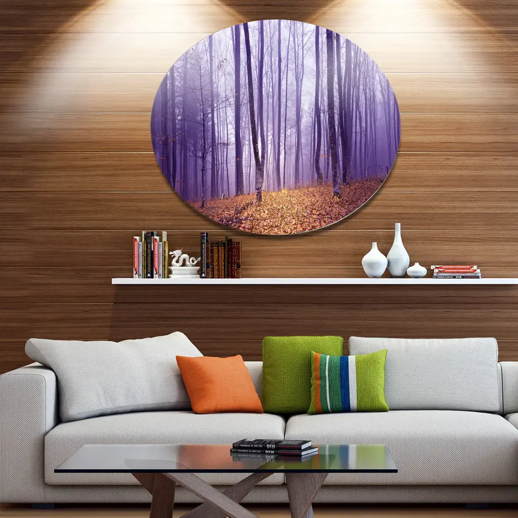 Bring Contemporary Abstraction to your home with this large Circle Metal wall art. This Magenta Foggy Fairytale Forest Metal Artwork makes it the focal point of any room or office. - White Gloss Coating ensures colors are extra vibrant with light reflection.- Aluminum grade Sheet Metal with 1 inch mounting frame on the back giving the illusion that the artwork is floating on the wall..- Mounting Brackets are included along with instructions.- High Quality Digital images are created directly into a glossy aluminum panel producing a stunning and captivating print into the glossy finish of the metal.- Water, Fire and Scratch resistant HD Aluminum panels.- Looks better than any photo paper and guaranteed to last at least 20 years- Easy to clean with a microfiber cloth. Colors are far superior to regular Canvas Art. - Easy to Hang