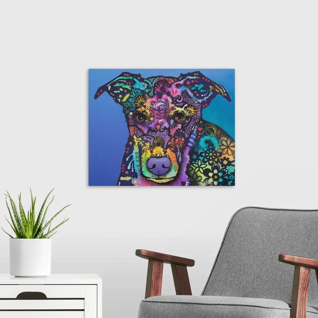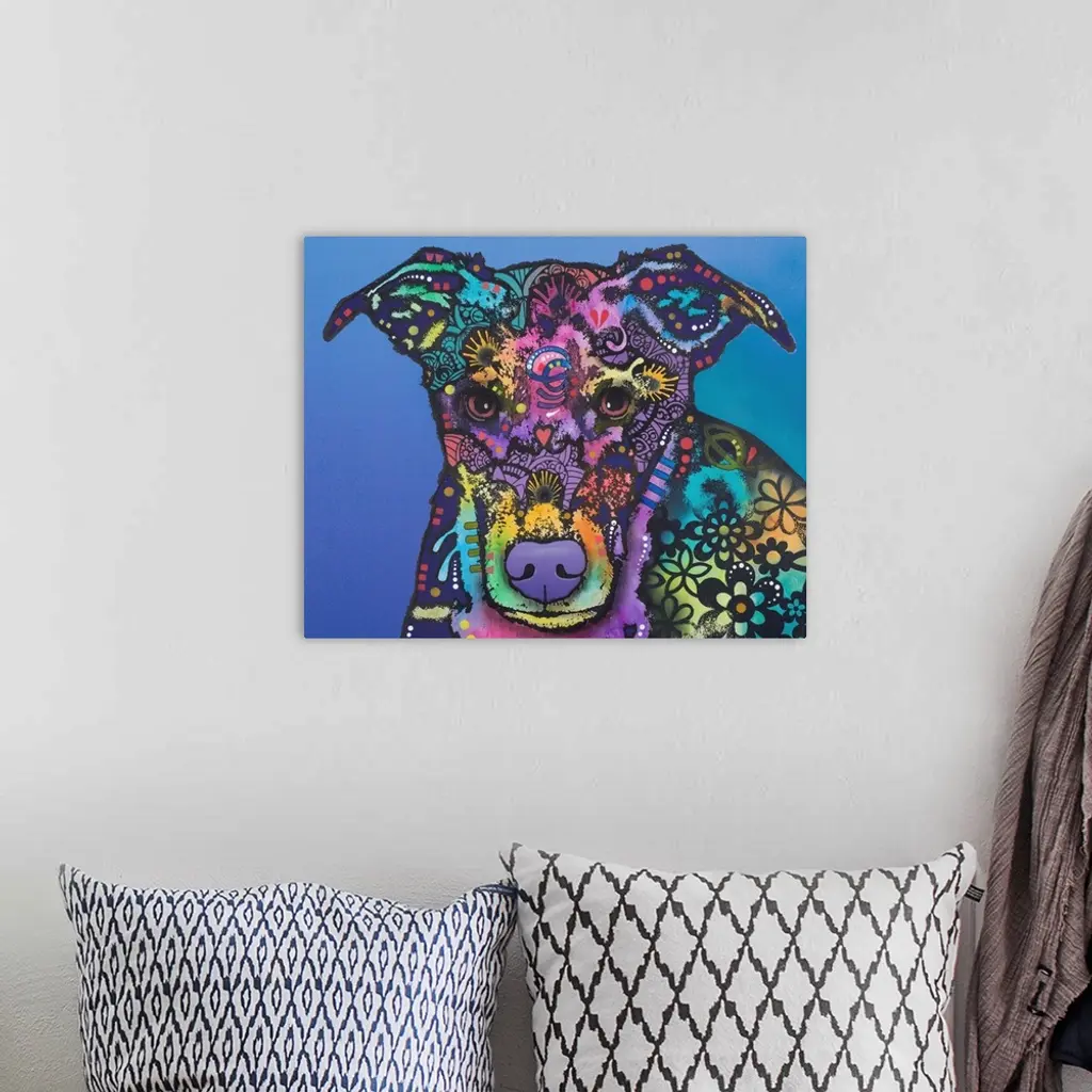 Colorful painting of a collie-retriever mix with abstract designs on a blue background.