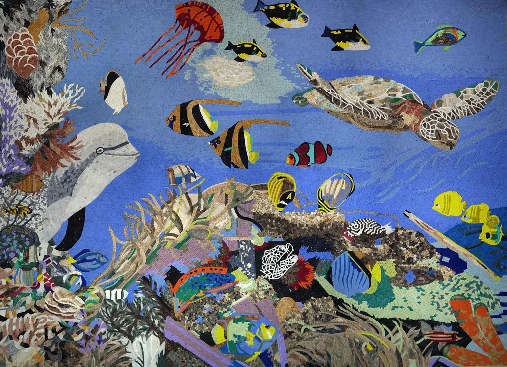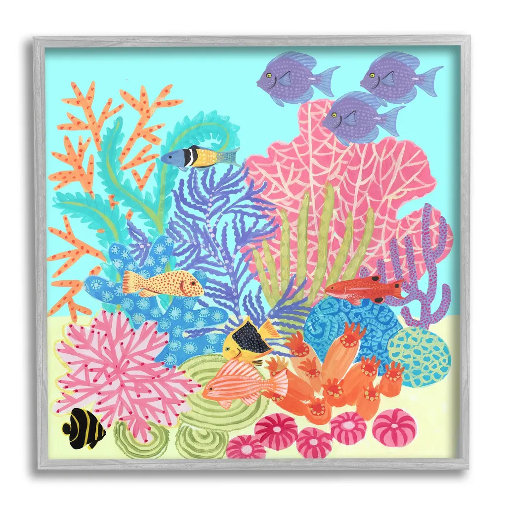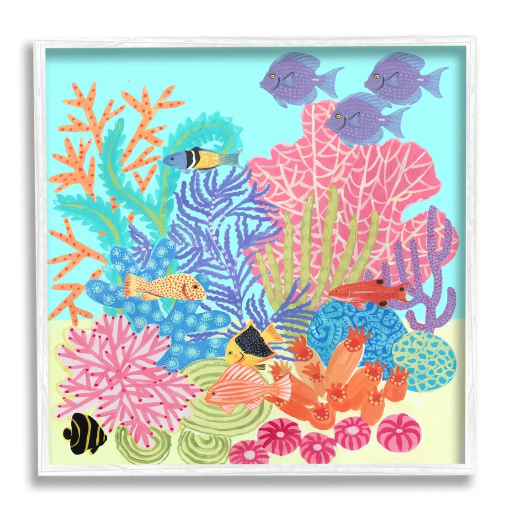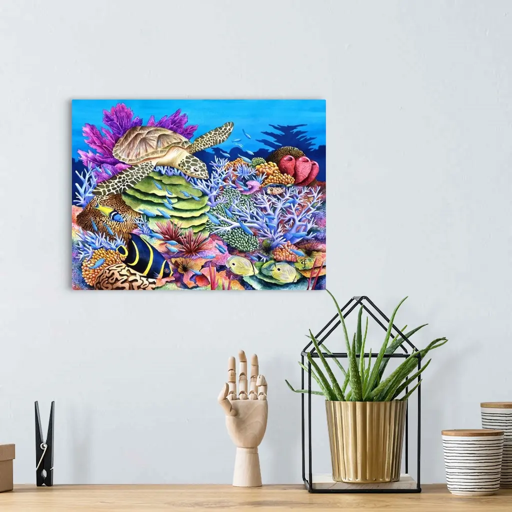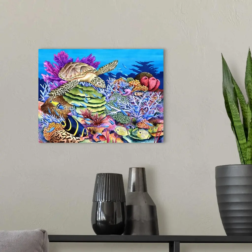 Tropical themed artwork using bright vivid colors to depict the flowers and animals of the environment.