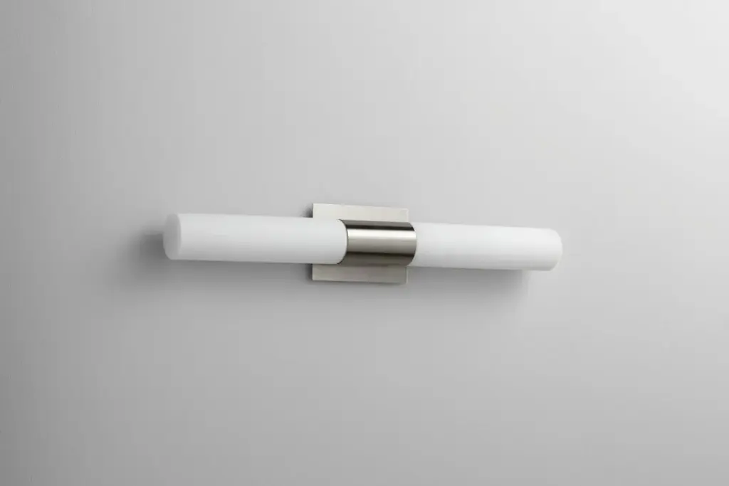 This 2-light bathroom vanity light from Oxygen is a part of the Magneta collection and comes in a satin nickel finish. It measures 27" wide x 5" high. Uses an integrated LED. Damp Rated. Can be used in humid environments like bathrooms or covered outdoor areas. This light requires 2 , 12W Watt Bulbs (Not Included) UL Certified.