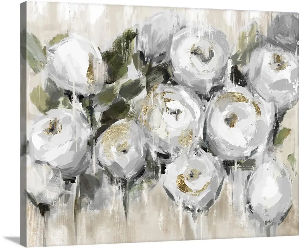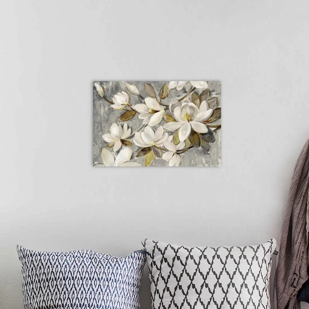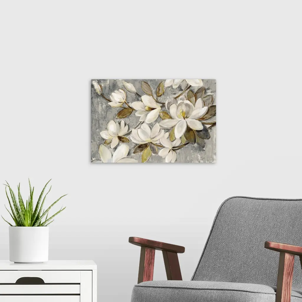 Contemporary painting of magnolia flowers on a textured gray and cream colored background.