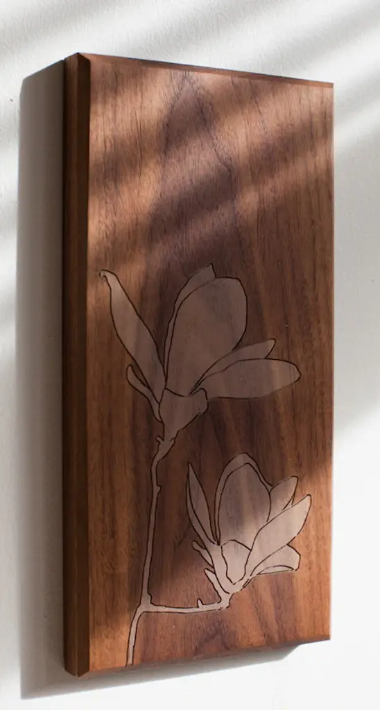Magnolia, CNC routed in solid walnut.- Made in USA.