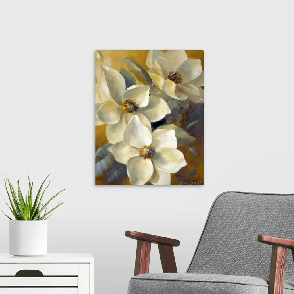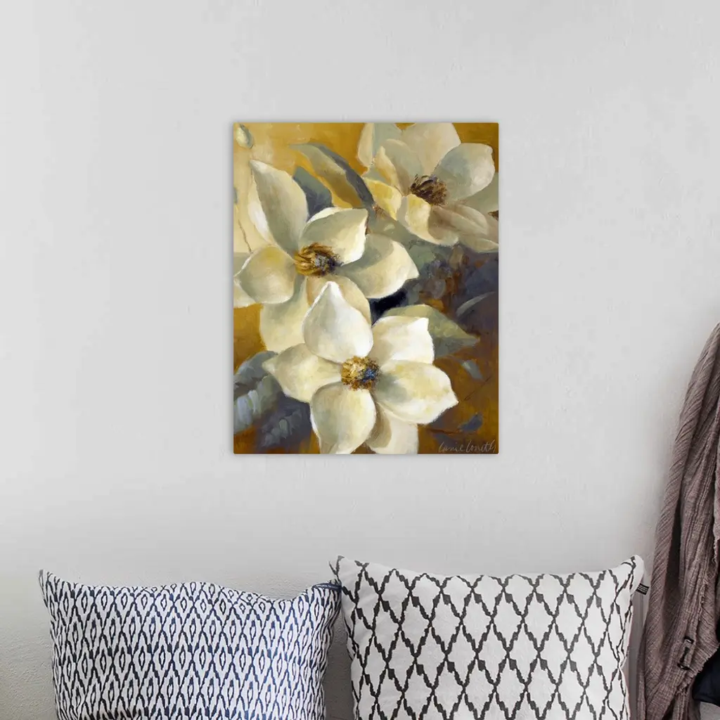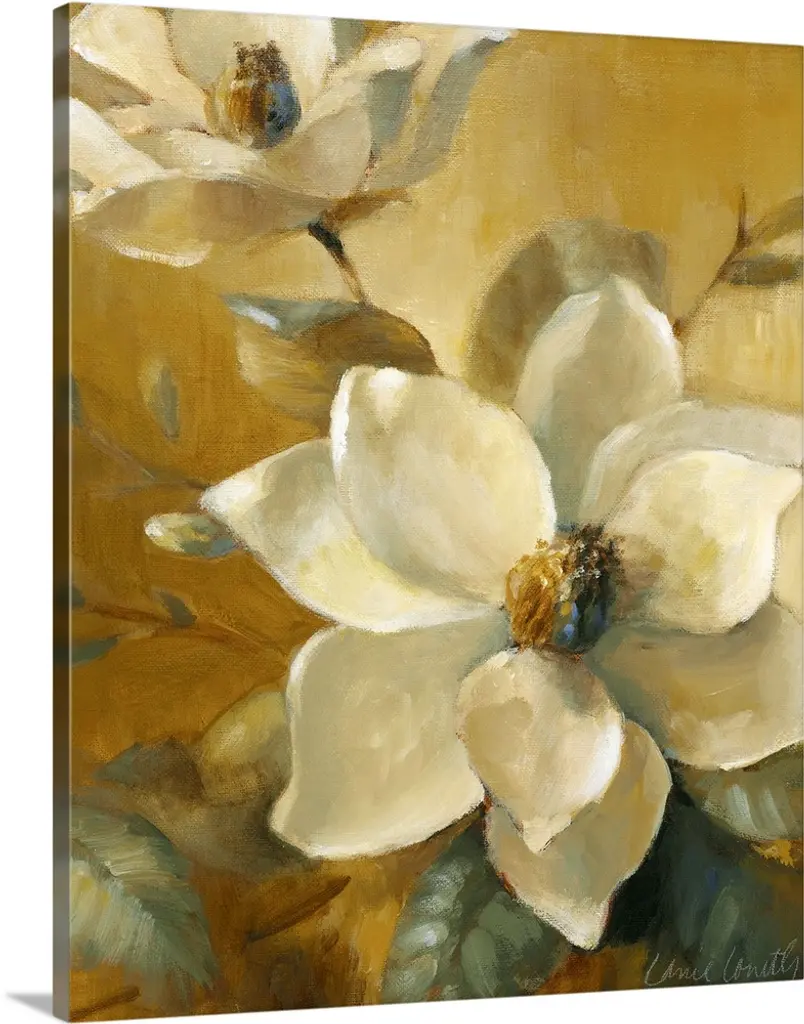 Large, portrait floral painting of several blooming magnolias and their leaves, glowing in the evening sunlight, on a golden background.