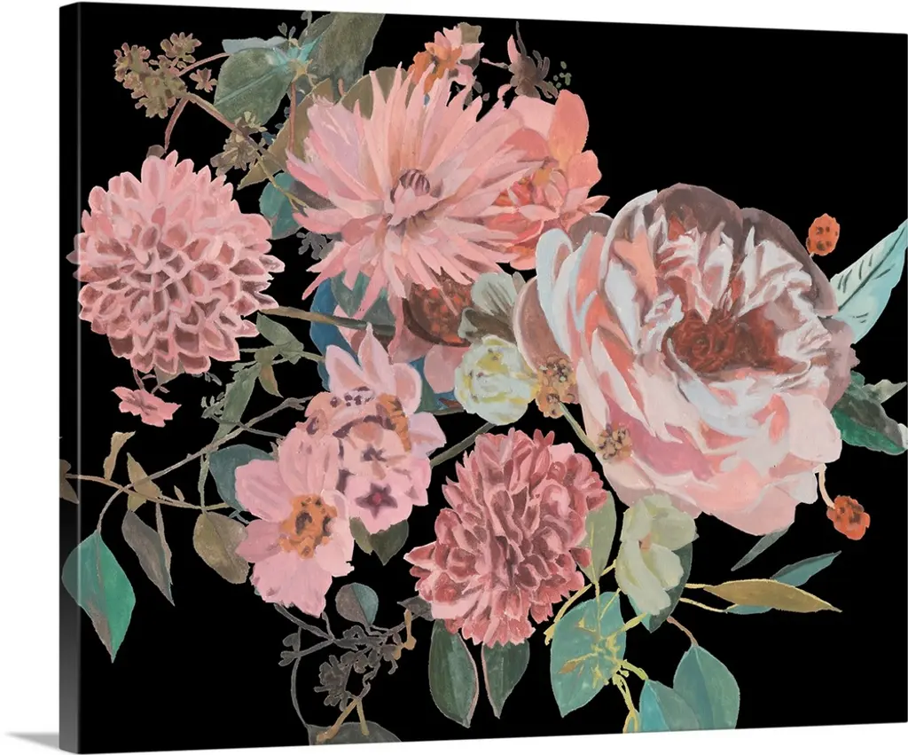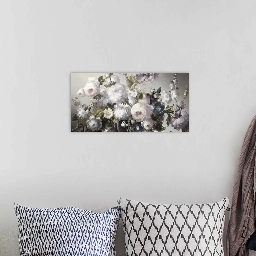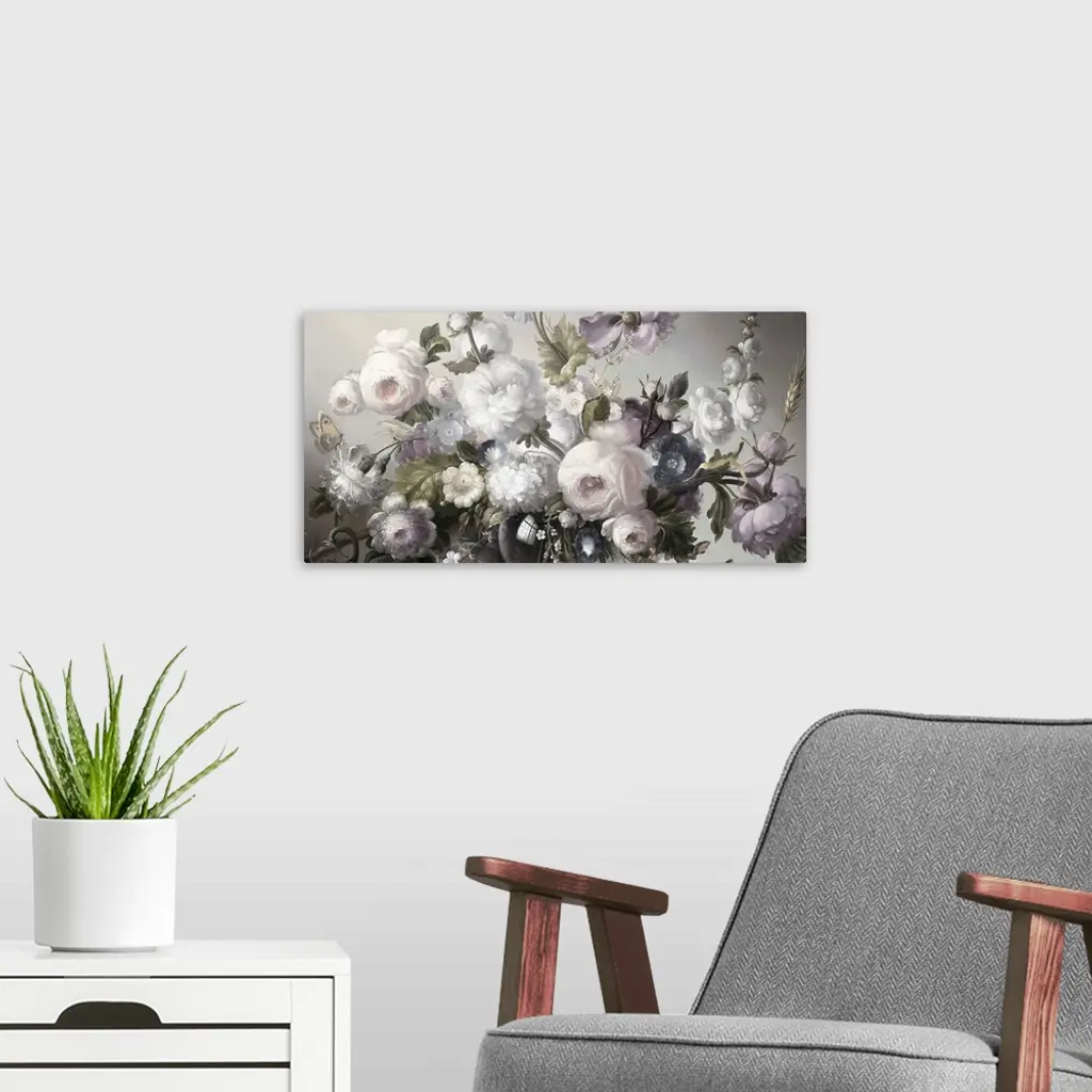 Desaturated artwork showing a romantic bouquet of flowers over a light background.