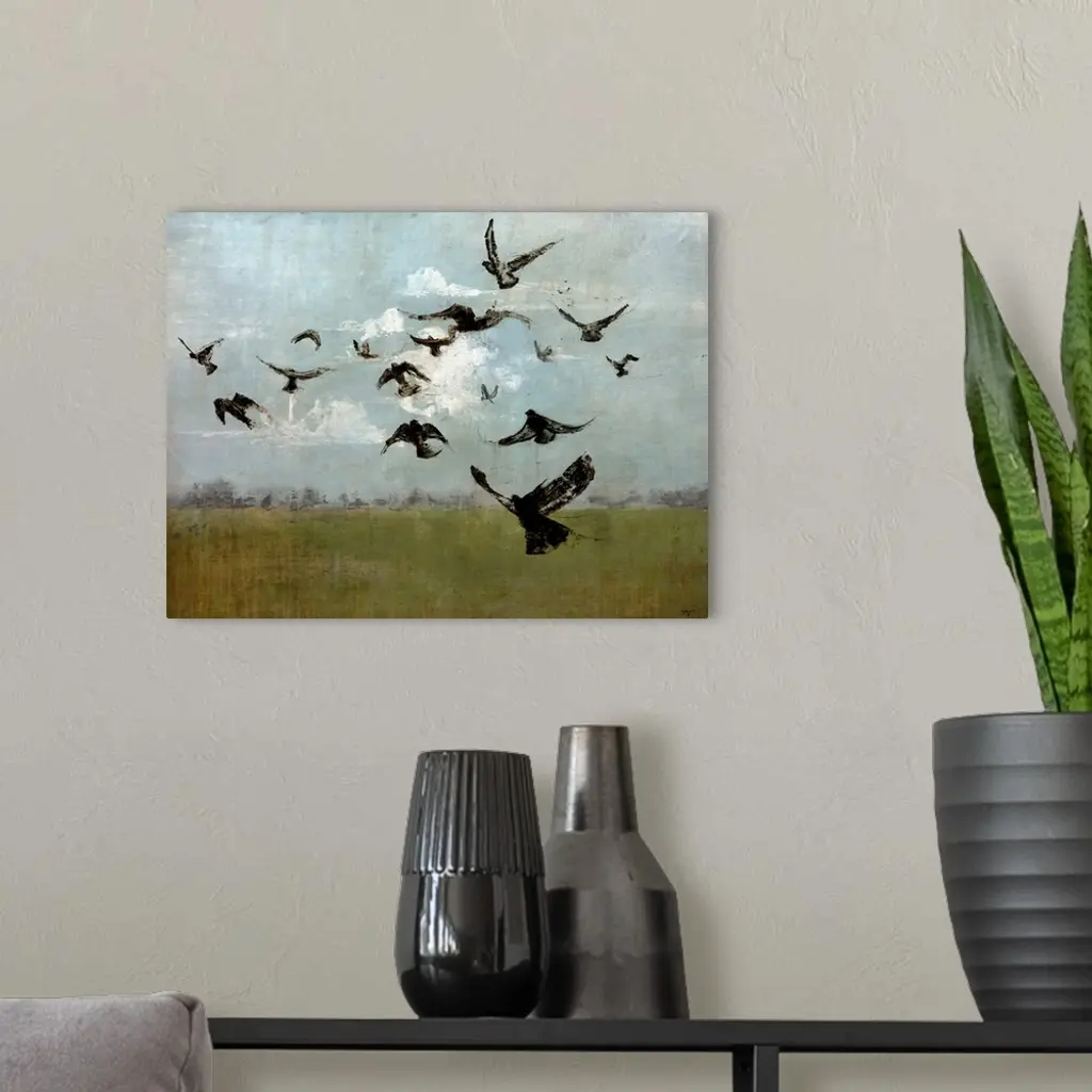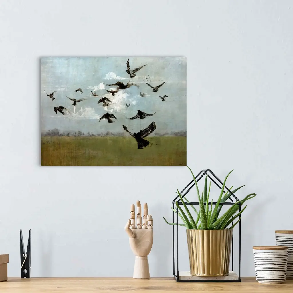 Contemporary painting of bird silhouettes flying in cloudy sky.