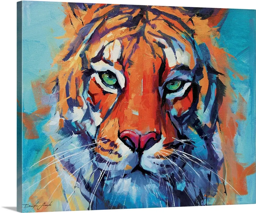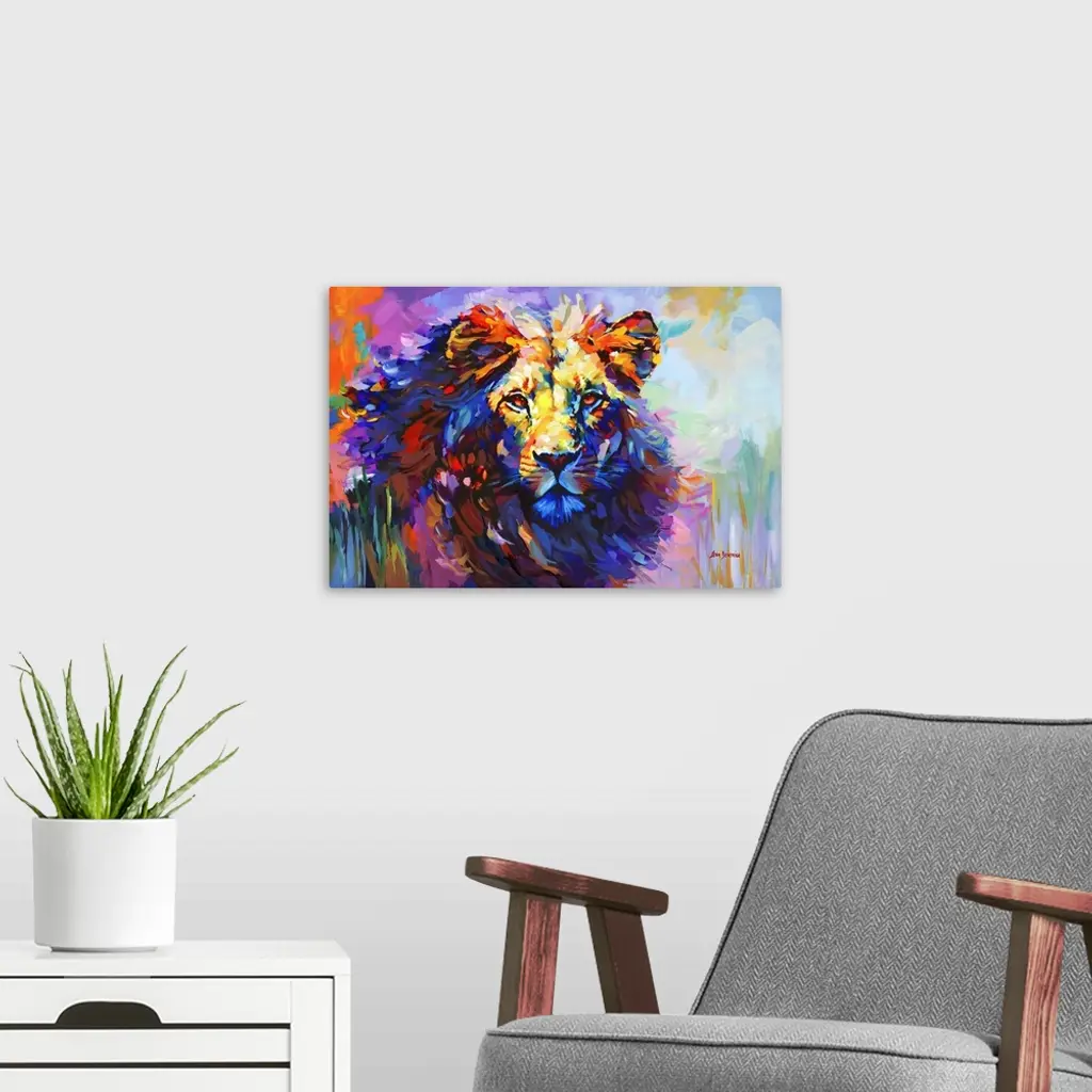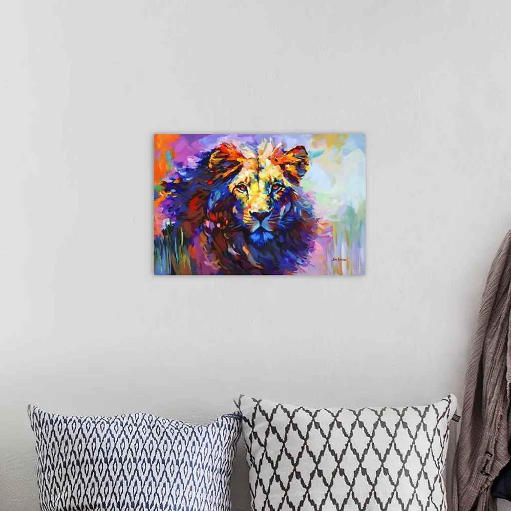 This contemporary artwork offers a striking portrayal of a lion, rendered in a spectrum of vivid colors that capture the animal's serene majesty, perfect for adding a touch of wildlife-inspired beauty to any setting.