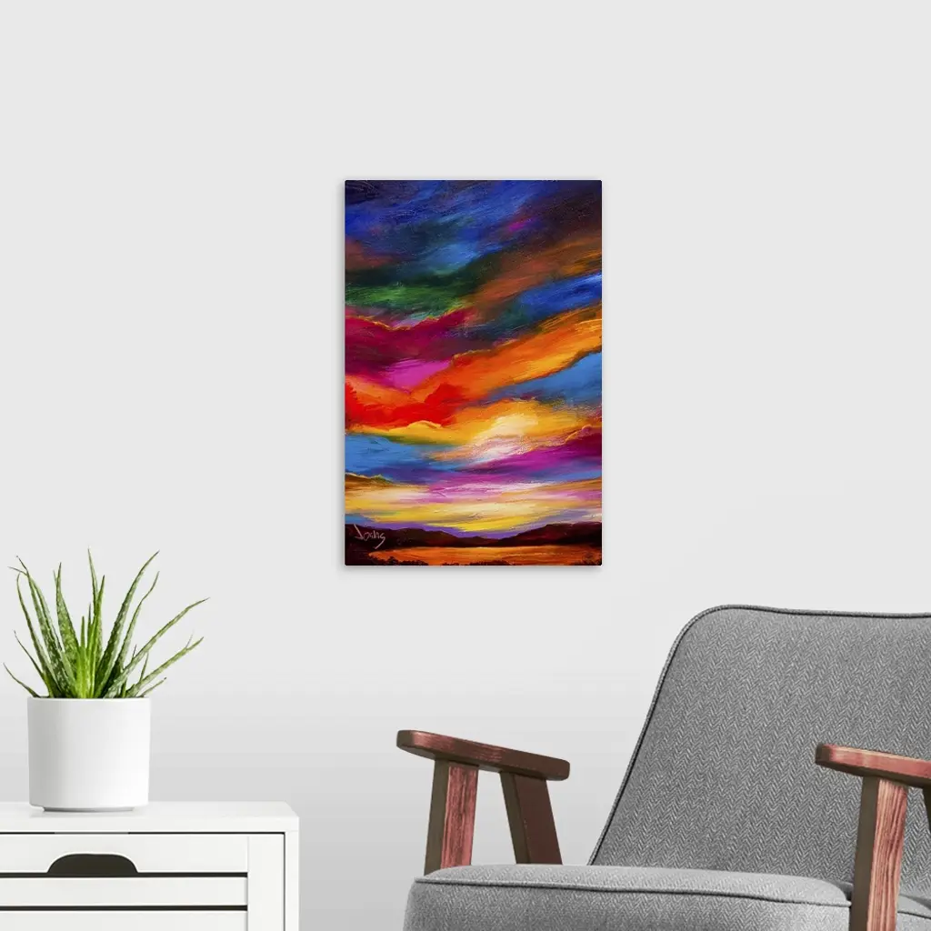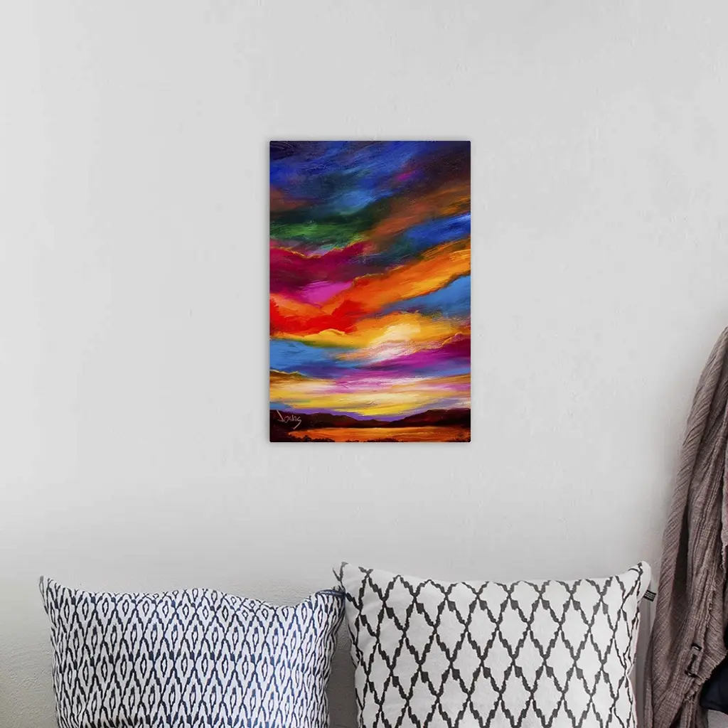 A contemporary painting of a sunset sky ranging in a gamut of color.