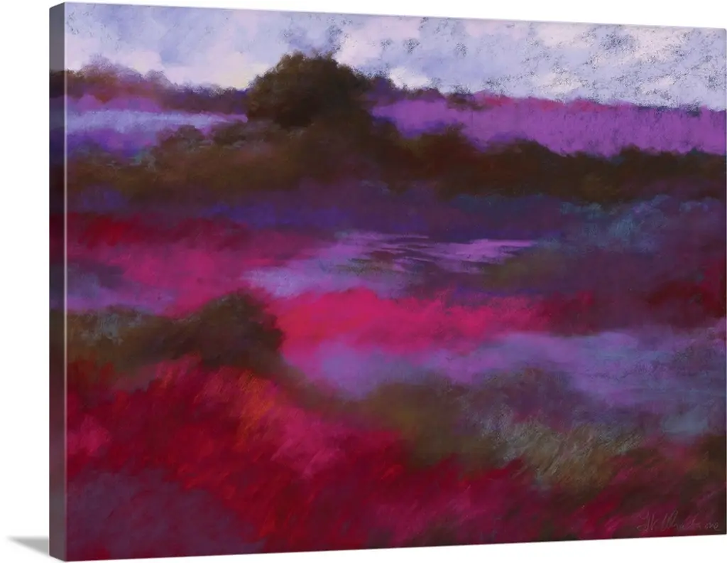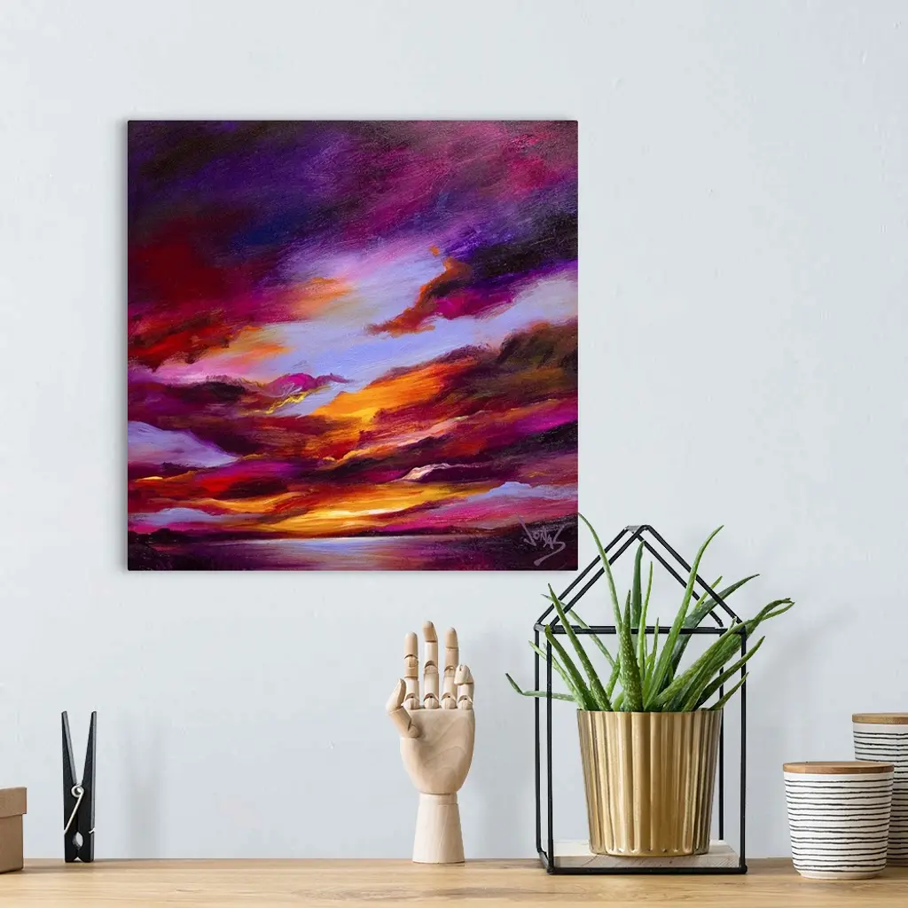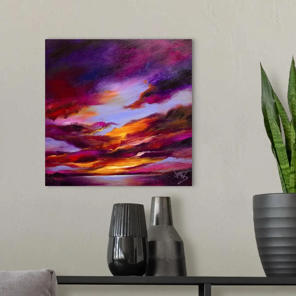 Contemporary painting of a sunset sky in purple and orange tones over the water.