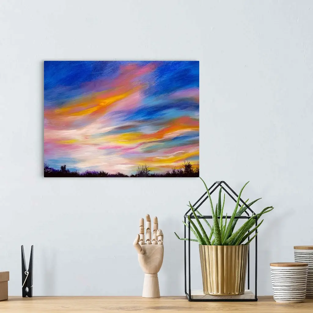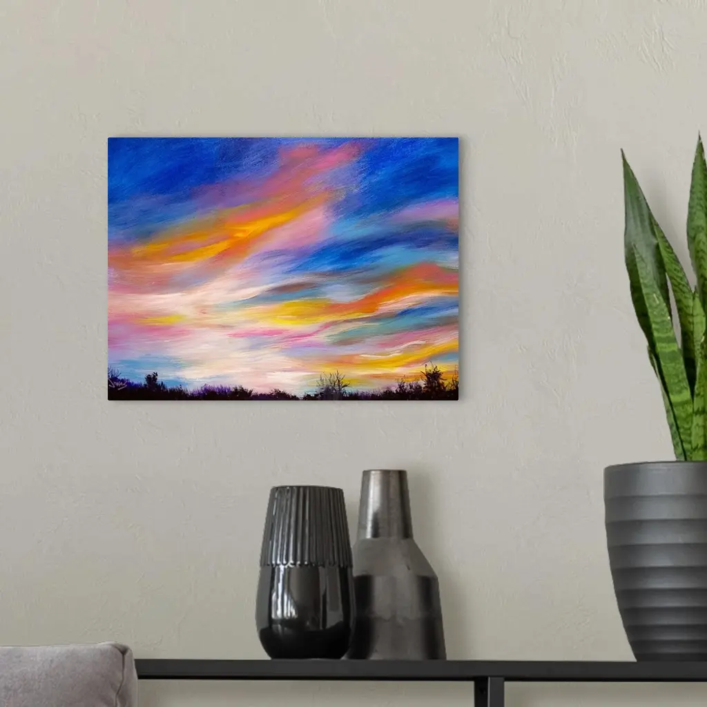 A contemporary painting of a colorful skyscape at sundown.