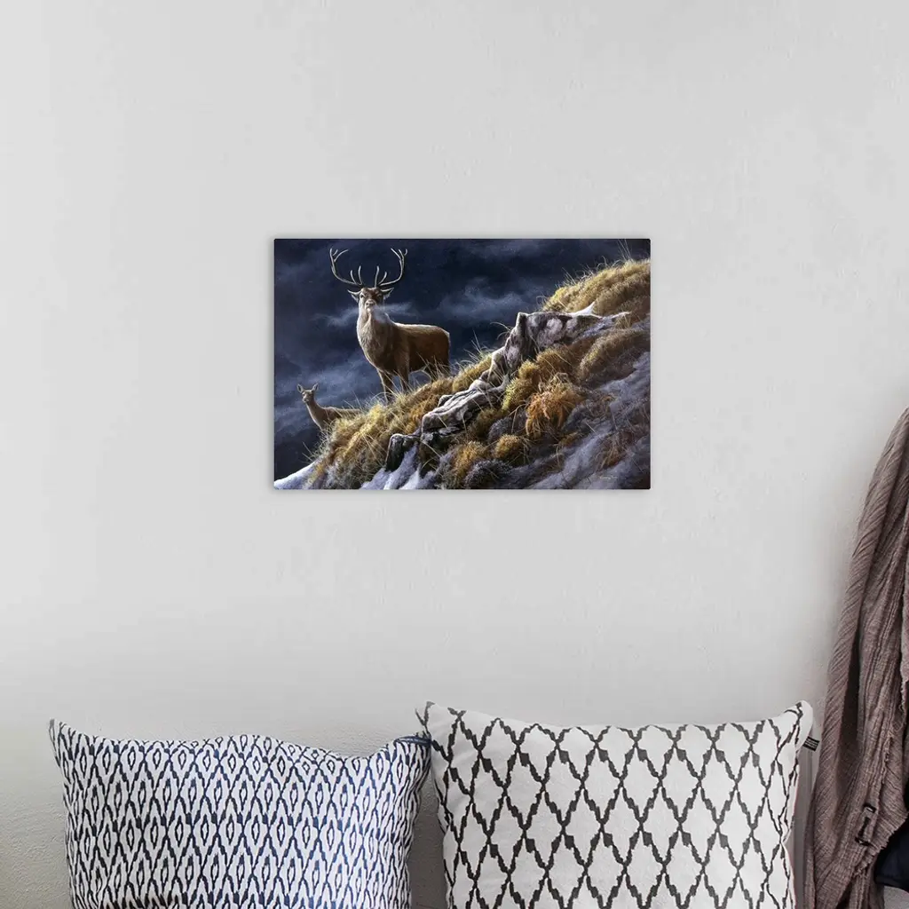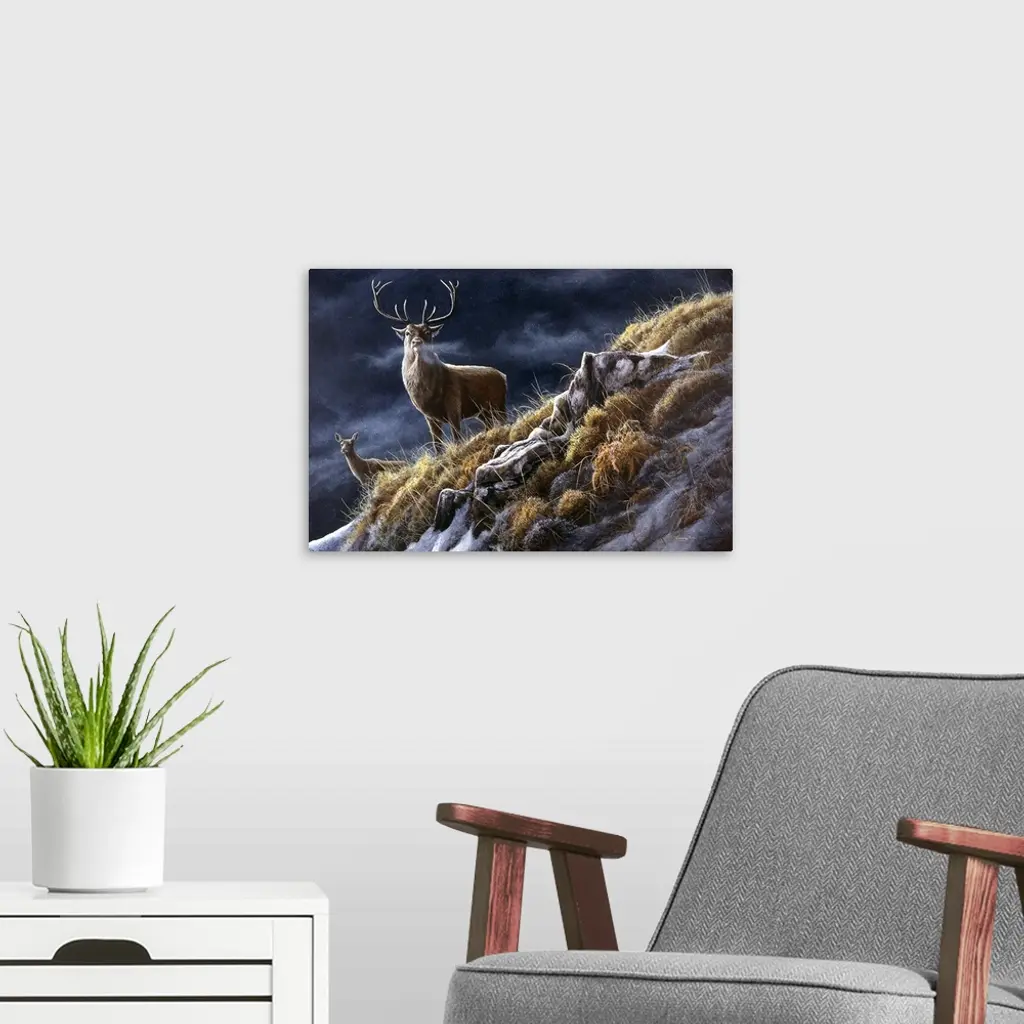 A life-like traditional style wildlife painting of a buck deer with antlers standing on a snowy, grassy hillside