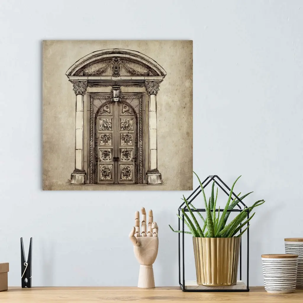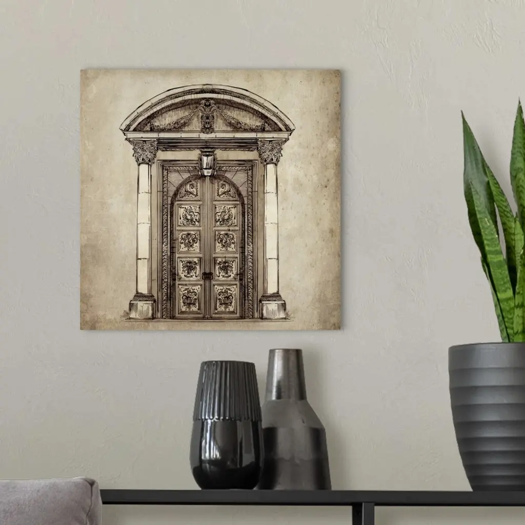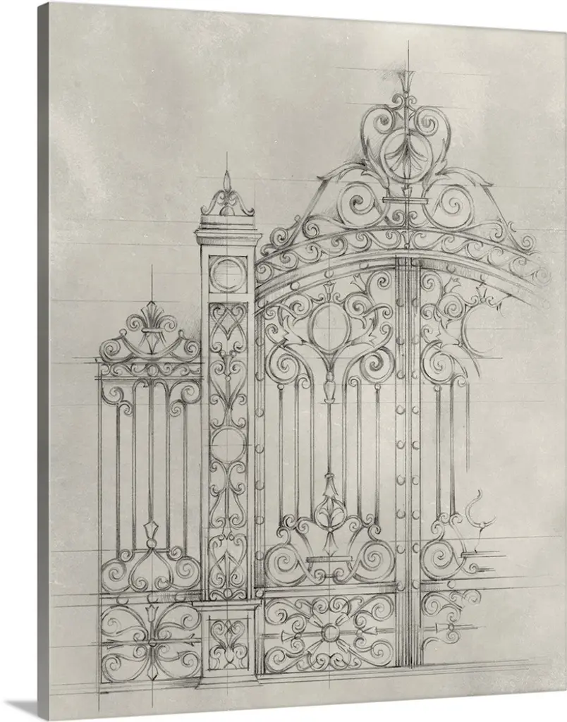 Contemporary artwork of an architectural drawing, in a weathered and rustic style.