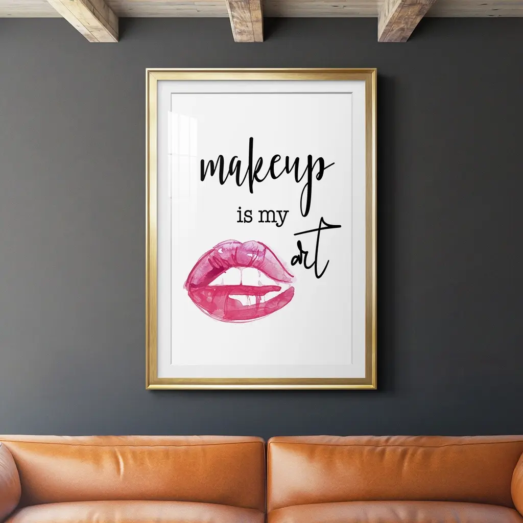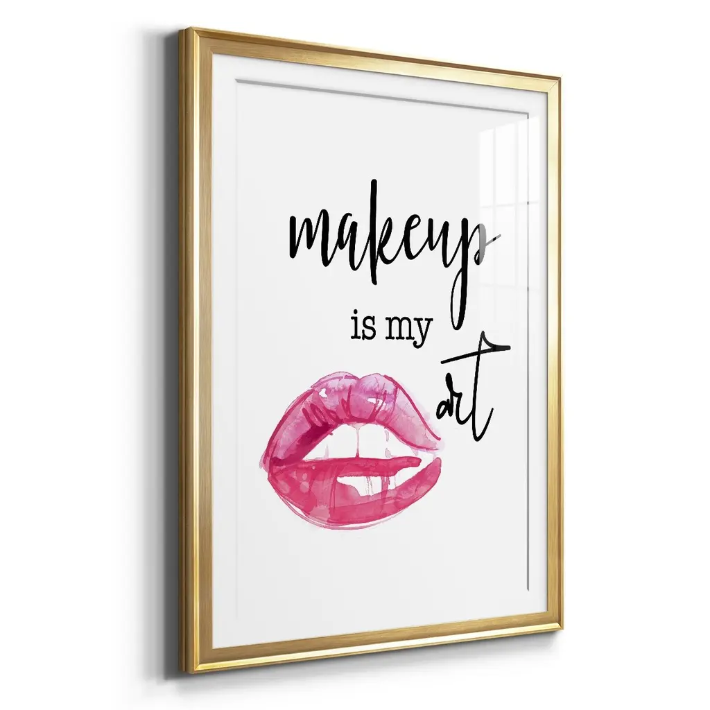 Makeup is My Art Premium Framed Print - Ready to Hang A Premium Framed Print created to last. Framed in distressed wood and available in an array of sizes and colors Featuring a beveled a solid wood stretcher bar, each piece comes ready to hand 4 SIZES AVAILABLE 30.5''X42.5'' - Overall Size 26.5'X36.5'' - Overall Size 22.5''x30.5'' - Overall Size 18.5''x24.5'' - Overall Size Each piece is made to order. Each piece comes with hanging hardware. Made in the USA Ready to Hang Giclee Paper Print Acrylic Glass Beveled Matt Board