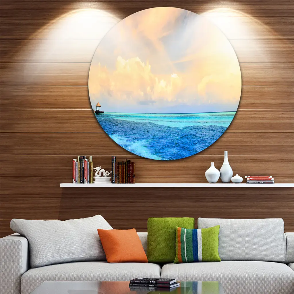 Bring Contemporary Abstraction to your home with this large Circle Metal wall art. This Maldives Bungalows Sunset Panorama Metal Artwork makes it the focal point of any room or office. - White Gloss Coating ensures colors are extra vibrant with light reflection.- Aluminum grade Sheet Metal with 1 inch mounting frame on the back giving the illusion that the artwork is floating on the wall..- Mounting Brackets are included along with instructions.- High Quality Digital images are created directly into a glossy aluminum panel producing a stunning and captivating print into the glossy finish of the metal.- Water, Fire and Scratch resistant HD Aluminum panels.- Looks better than any photo paper and guaranteed to last at least 20 years- Easy to clean with a microfiber cloth. Colors are far superior to regular Canvas Art. - Easy to Hang