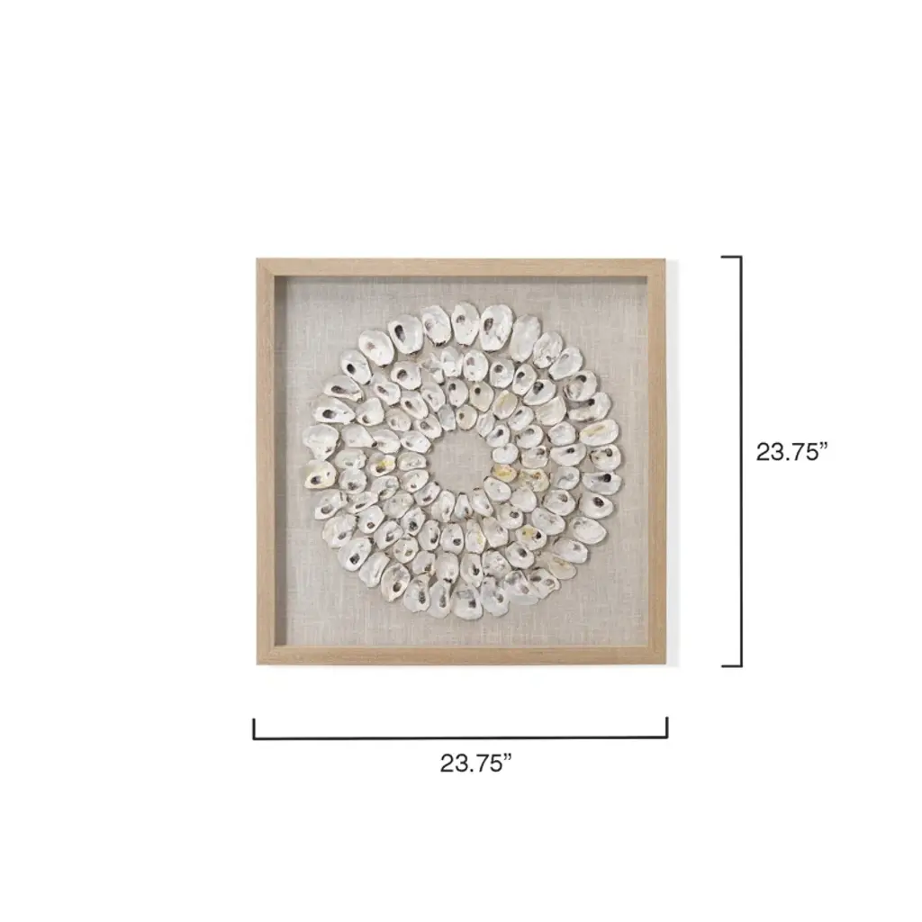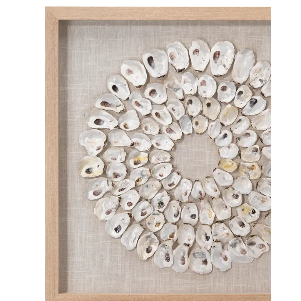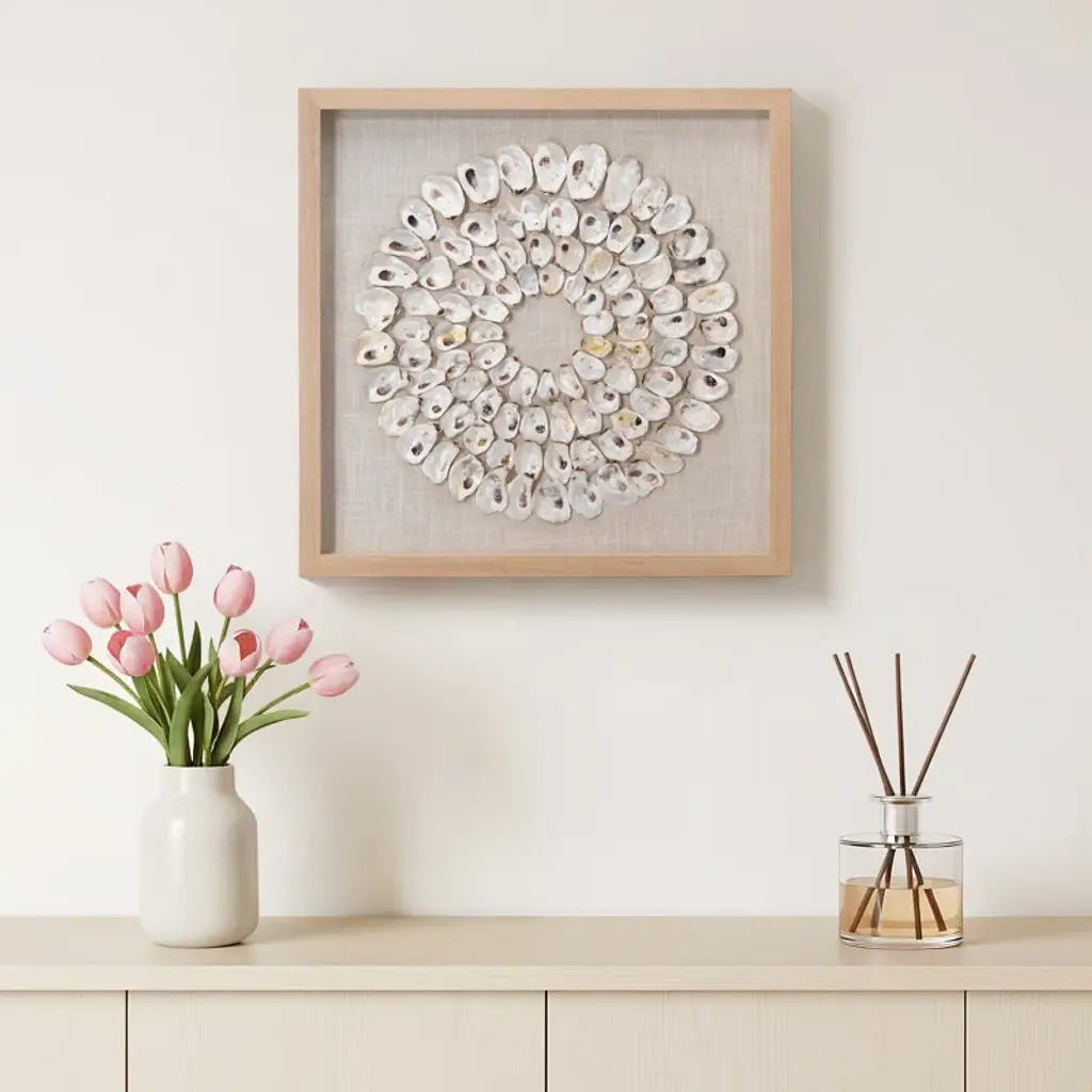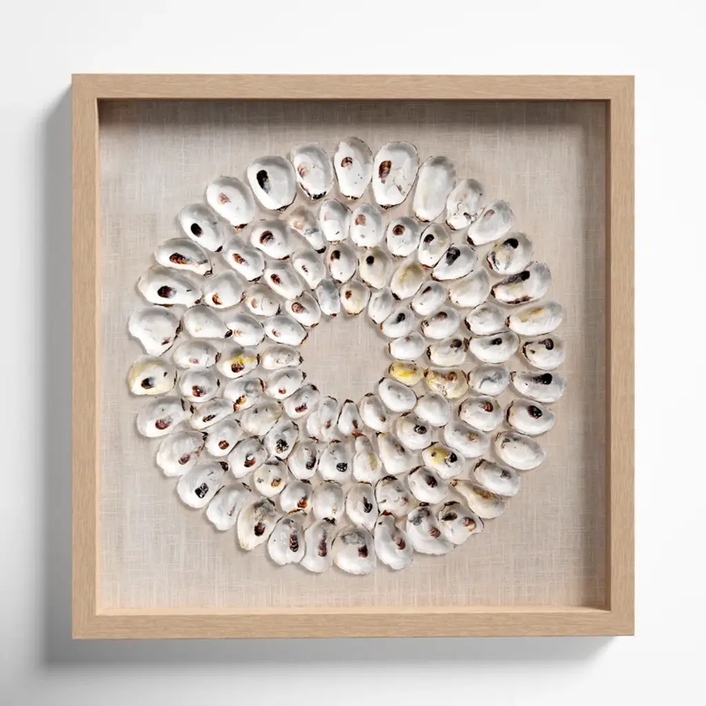 An assortment of natural abalone shells is arranged into shrinking concentric circles that highlight its mesmerizing organic beauty with a range of natural seaside colors and textures. Arranged by hand with natural materials and framed in wood, making each piece one of a kind. Position in your entryway, powder room, or bedroom for an earthy, eye-catching accent.