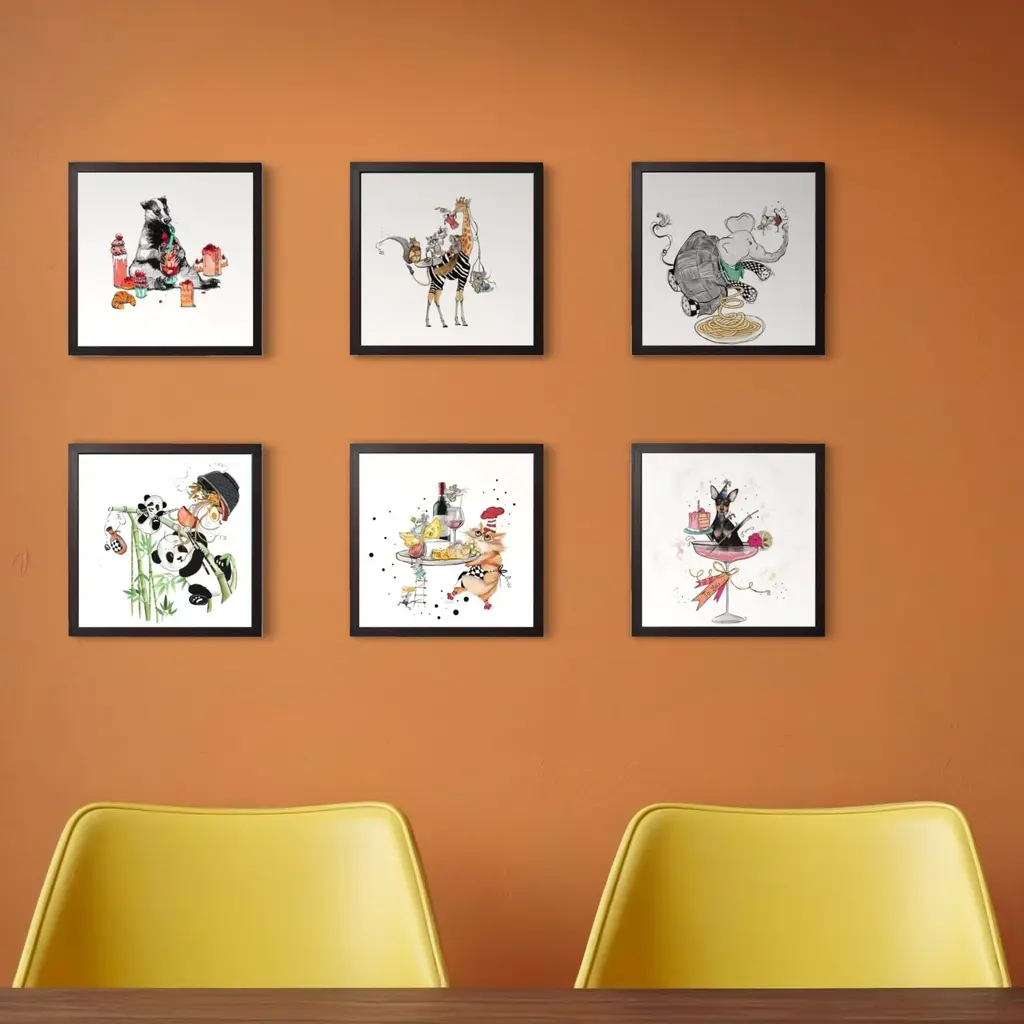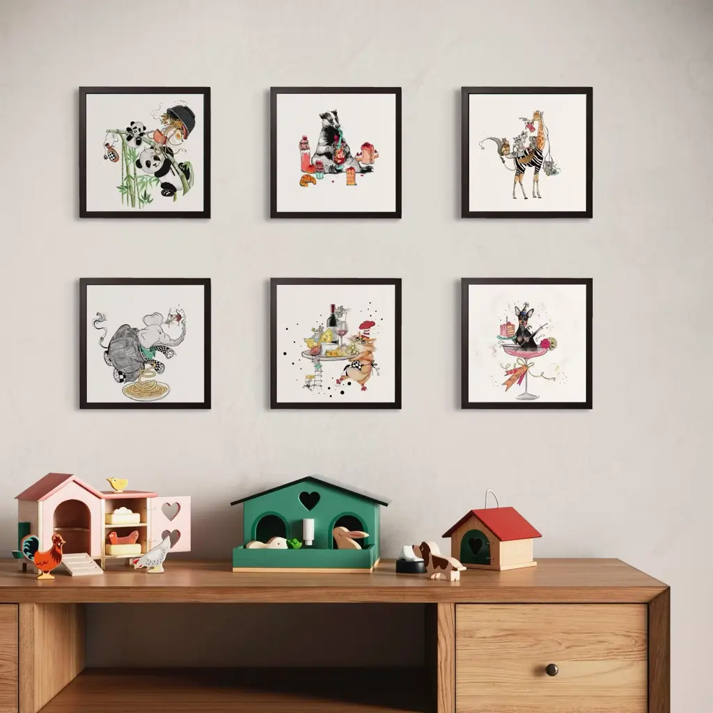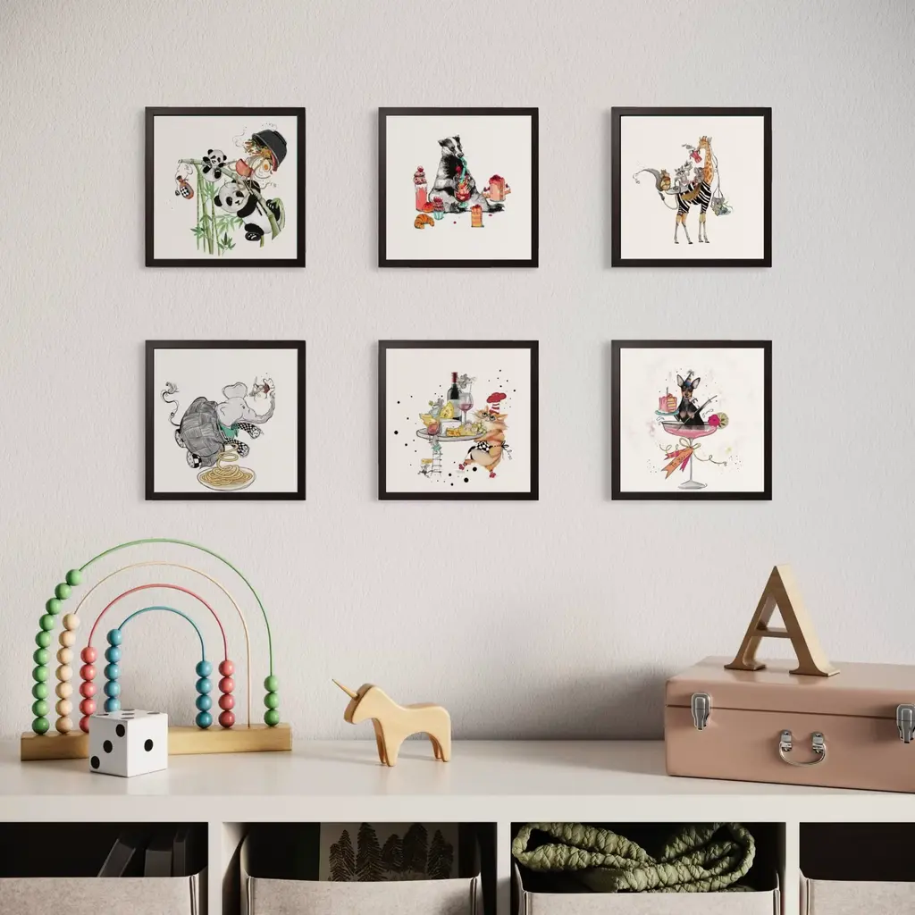 Mamma Mia Wall Art Set is a special Un Poco collection consisting of 6 pieces. Each illustration has been carefully hand-drawn by the artist and brought to life through high-quality printing.Size: Each frame measures 22×22 cmPrint: Fine art printing with high resolutionFrame: Wood-look finishUse: Each piece comes with both a wall-mounting hook and a stand, so it can be displayed on the wall or placed on a shelf or table.The “Mamma Mia” collection is inspired by the flavors of Italy and our animal friends. These charming illustrations come to life in vibrant, lasting colors with fine art printing. With its wood-look frame and 22×22 cm size, each artwork tells a warm story—whether displayed on a wall or resting on a shelf.
