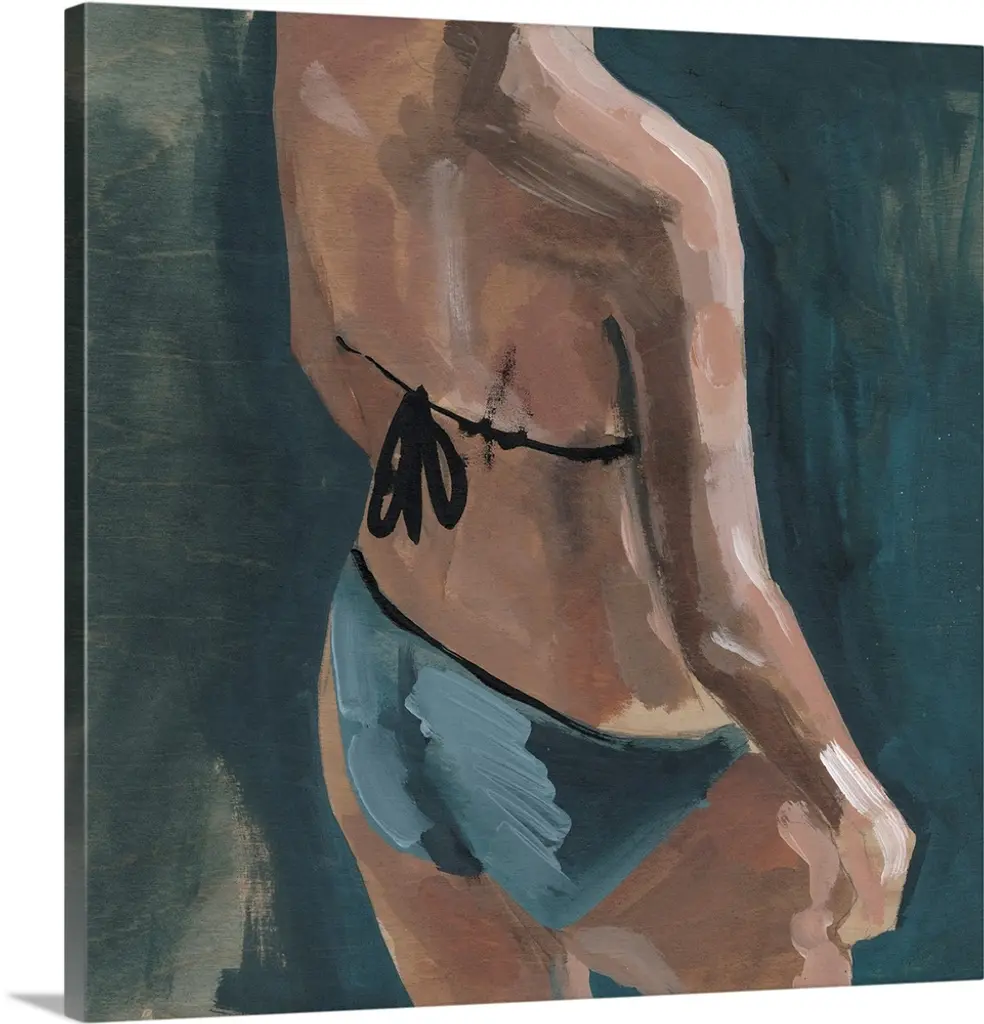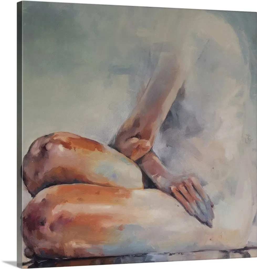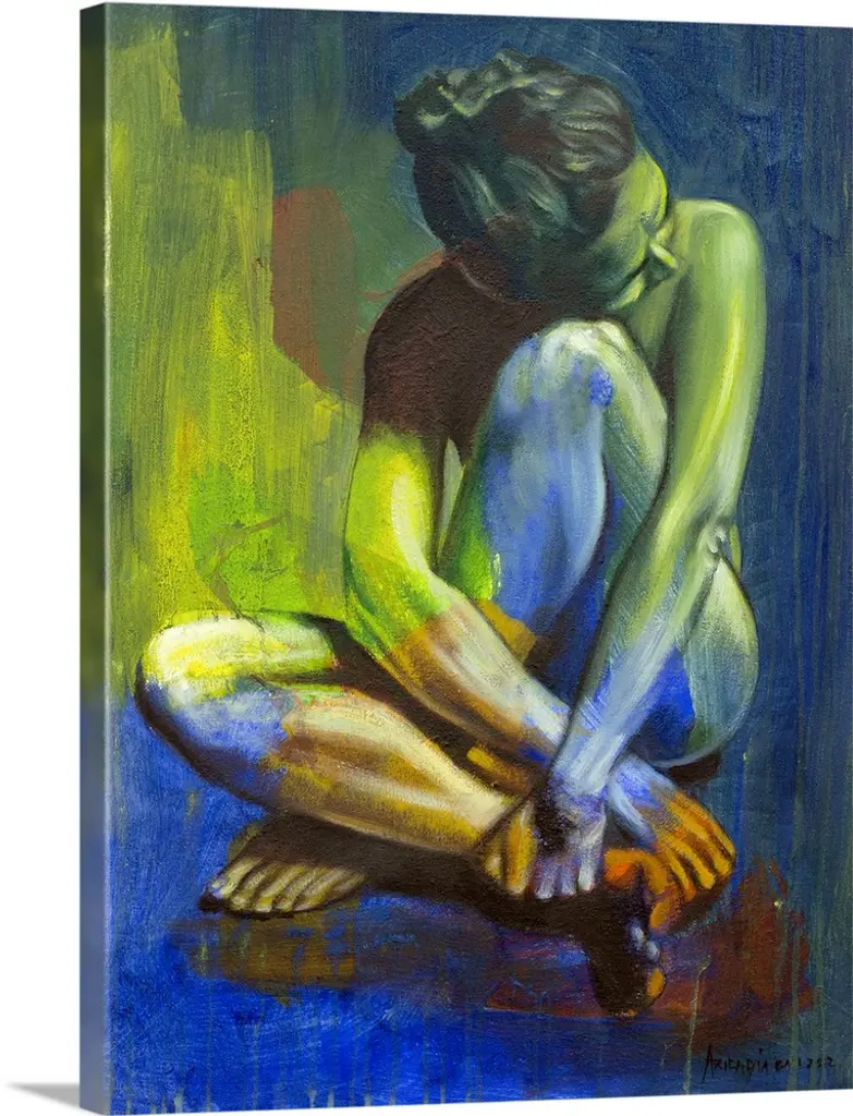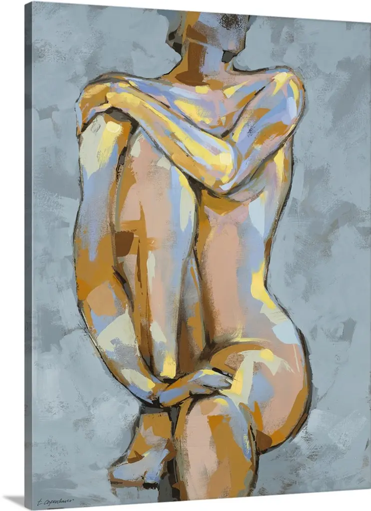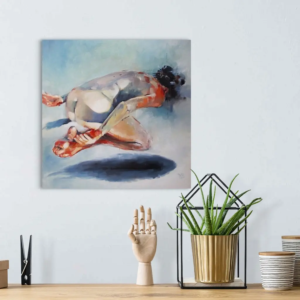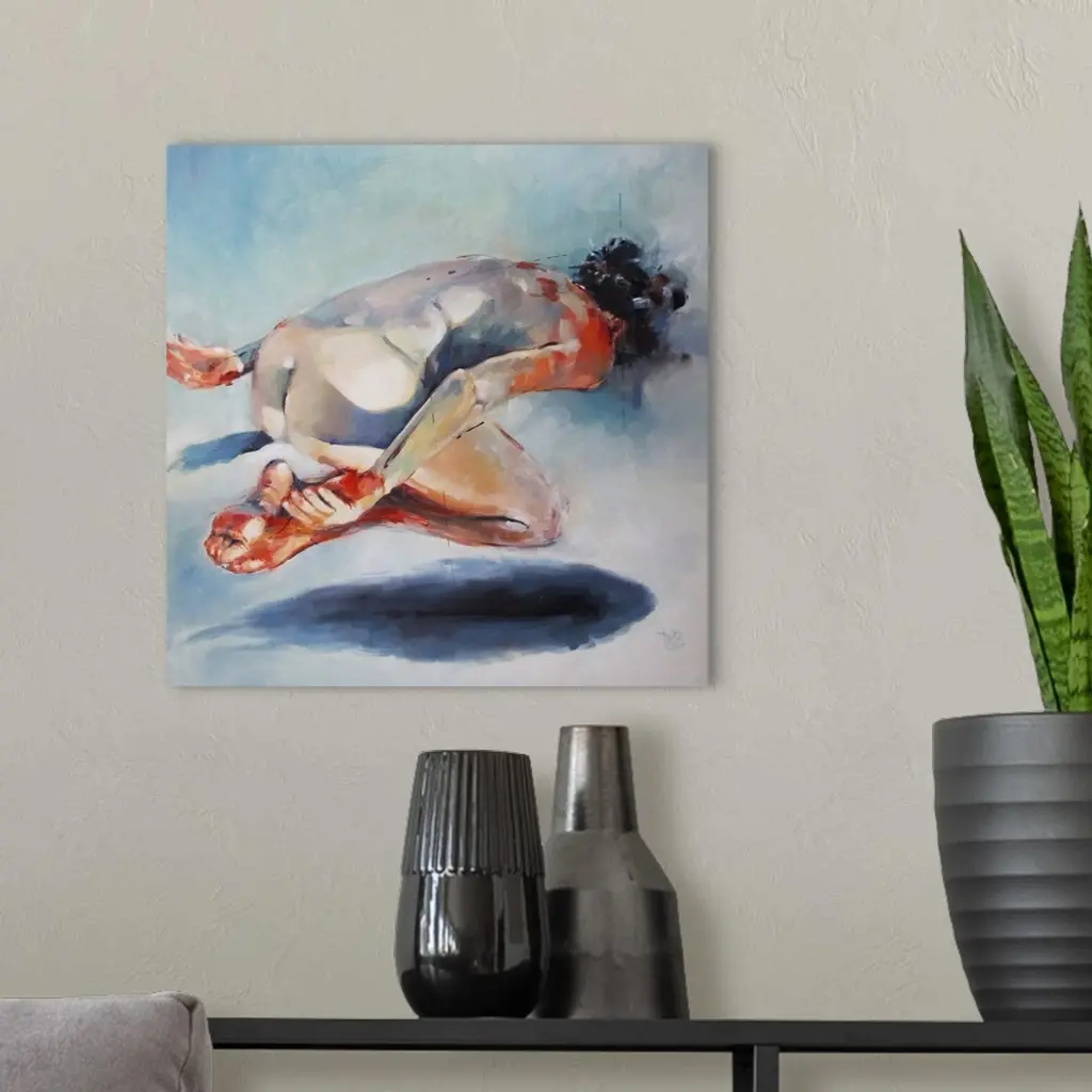 This contemporary artwork illustrates a levitating nude above a fish shadow with moody blues and striking oranges.