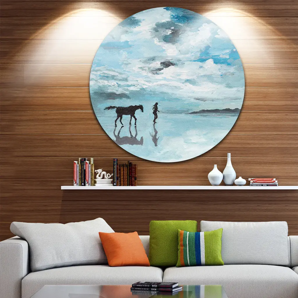 Man And Horse Running On Water, Seascape Painting Round Wall Art, 11"