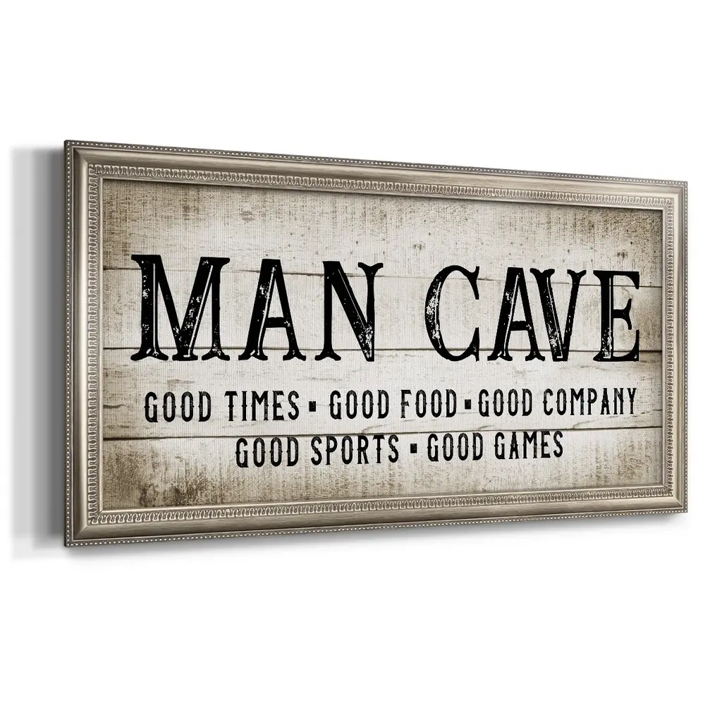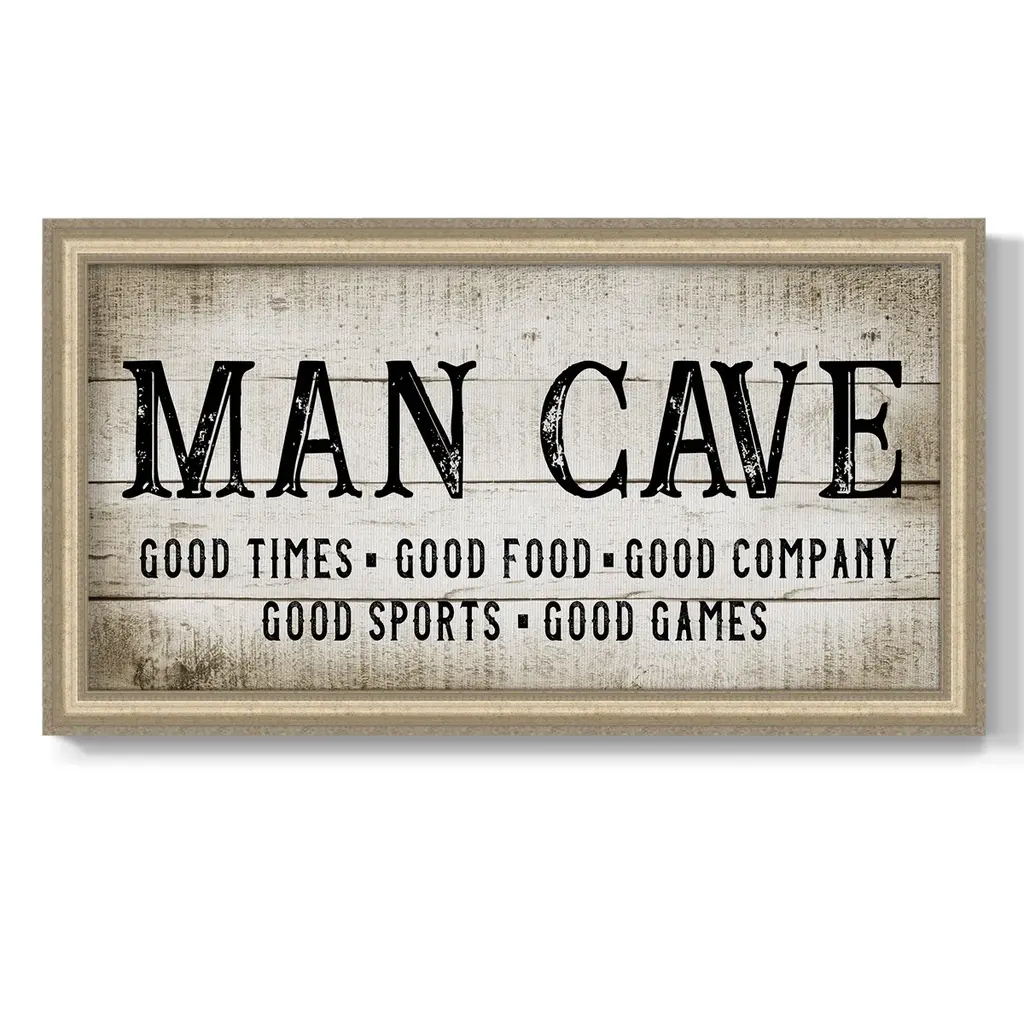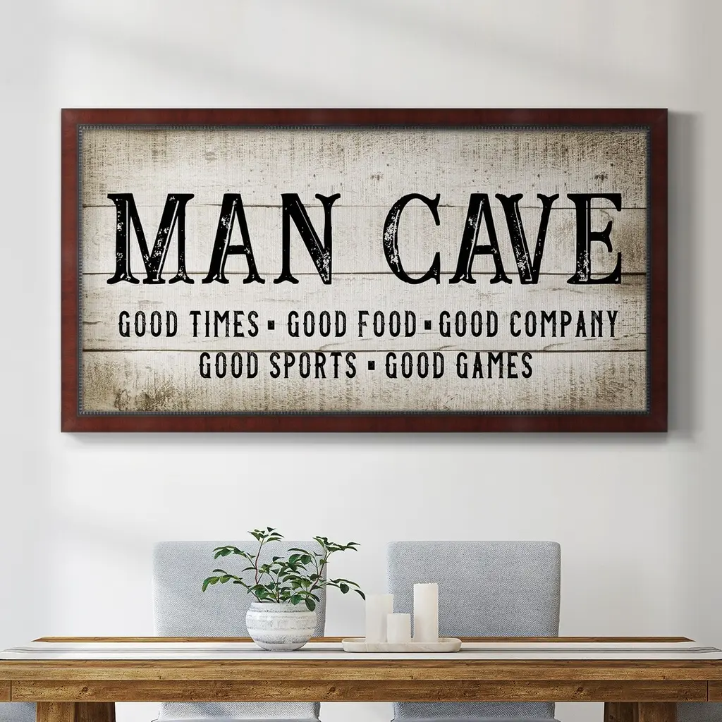 Man Cave Good Times Premium Framed Canvas- Ready to Hang A Premium Framed Canvas created to last. Framed in distressed wood and available in an array of sizes and colors Featuring a beveled a solid wood stretcher bar, each piece comes ready to hand 3 SIZES AVAILABLE 21''X37'' - Overall Size 25''X45'' - Overall Size 29''x53'' - Overall Size Each piece is made to order. Each piece comes with hanging hardware. Made in the USA Ready to Hang Giclee Paper Print Acrylic Glass Beveled Matt Board