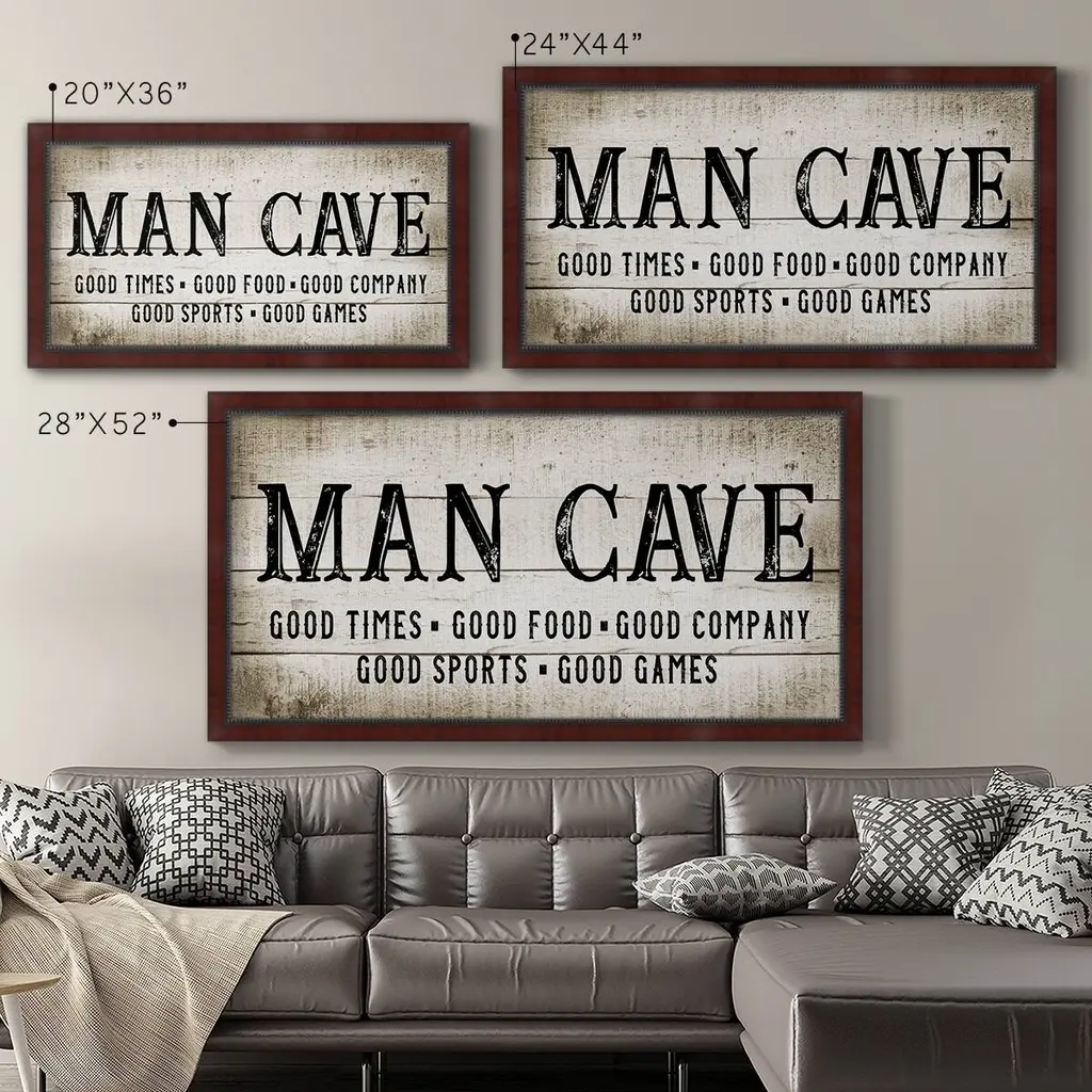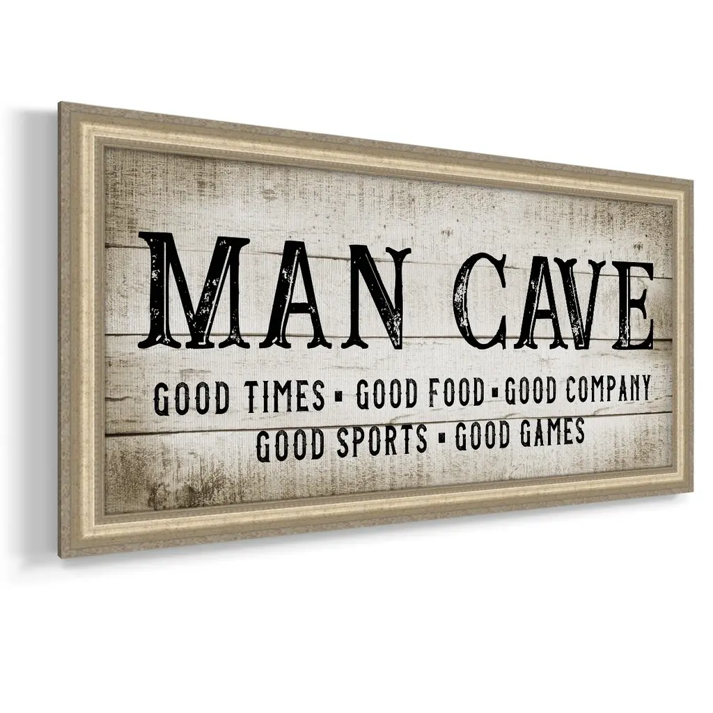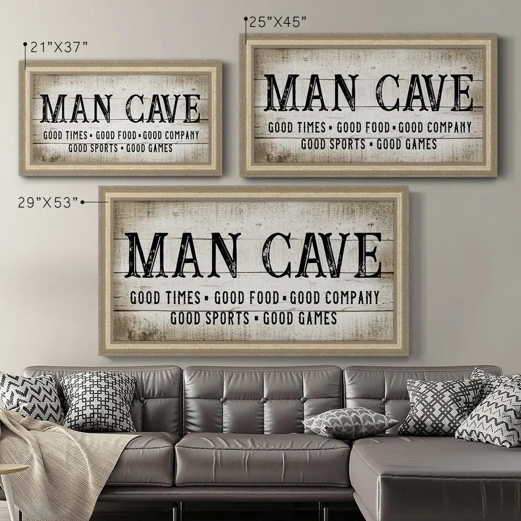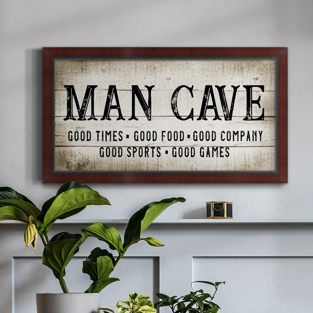 Man Cave Good Times Premium Framed Canvas- Ready to Hang A Premium Framed Canvas created to last. Framed in distressed wood and available in an array of sizes and colors Featuring a beveled a solid wood stretcher bar, each piece comes ready to hand 3 SIZES AVAILABLE 21''X37'' - Overall Size 25''X45'' - Overall Size 29''x53'' - Overall Size Each piece is made to order. Each piece comes with hanging hardware. Made in the USA Ready to Hang Giclee Paper Print Acrylic Glass Beveled Matt Board