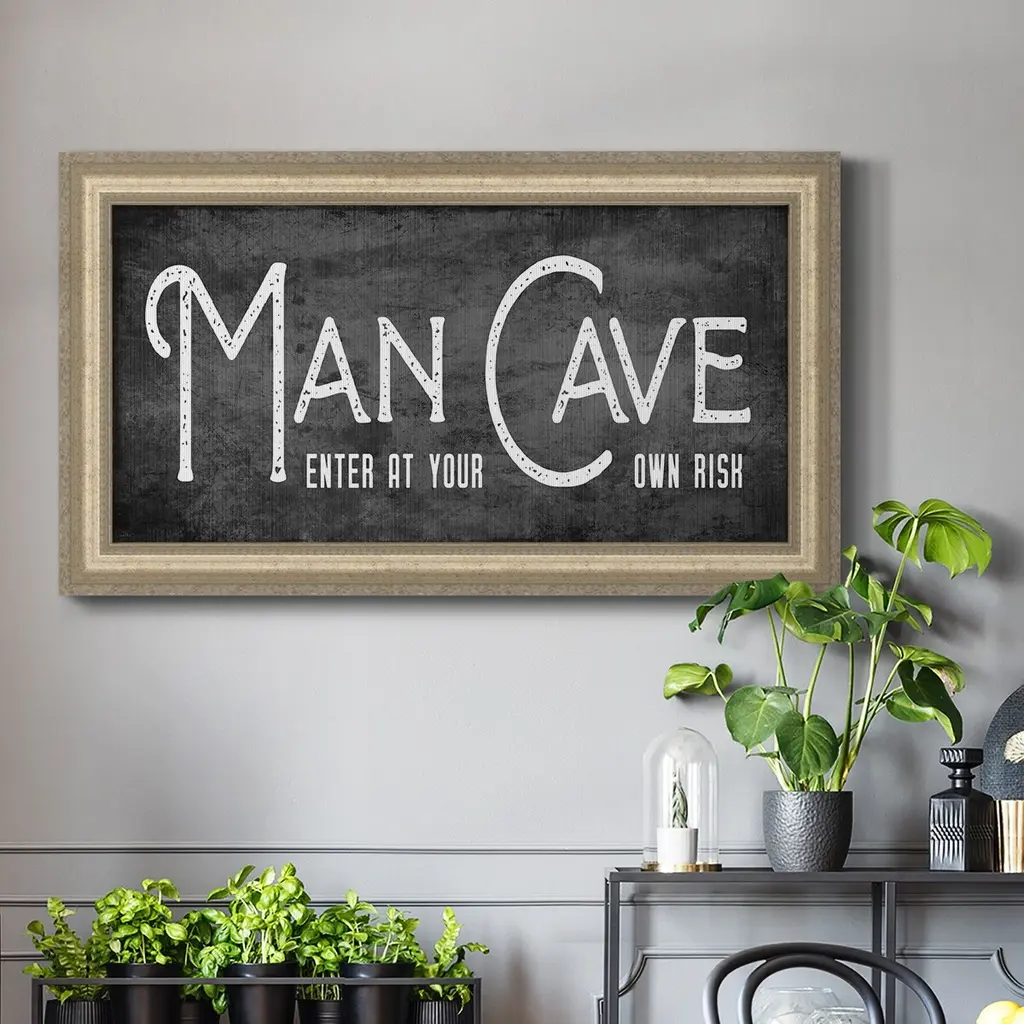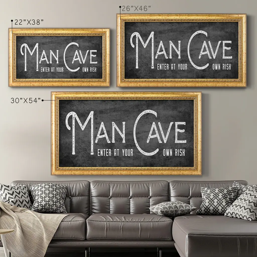 Man Cave Premium Framed Canvas- Ready to Hang A Premium Framed Canvas created to last. Framed in distressed wood and available in an array of sizes and colors Featuring a beveled a solid wood stretcher bar, each piece comes ready to hand 3 SIZES AVAILABLE 21''X37'' - Overall Size 25''X45'' - Overall Size 29''x53'' - Overall Size Each piece is made to order. Each piece comes with hanging hardware. Made in the USA Ready to Hang Giclee Paper Print Acrylic Glass Beveled Matt Board