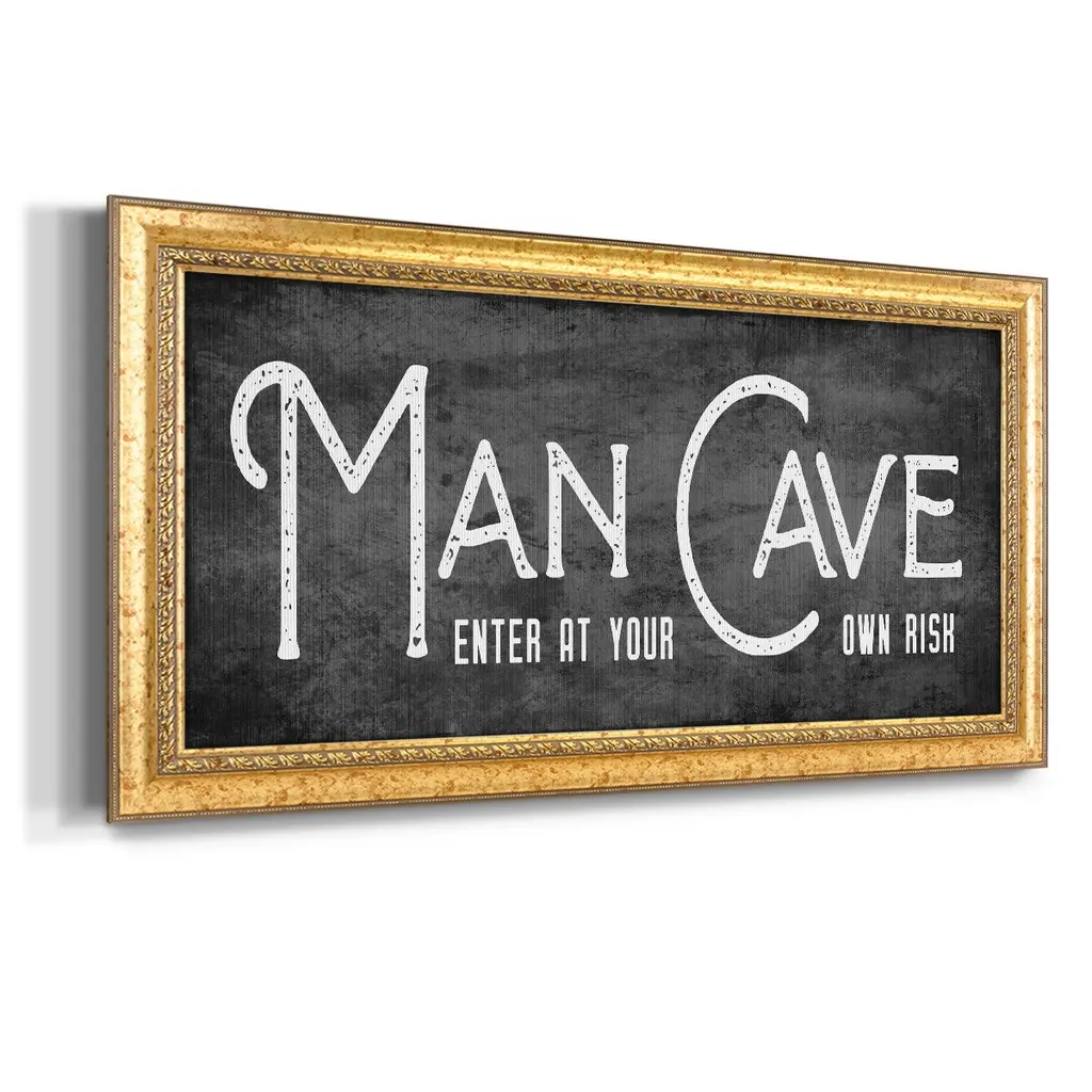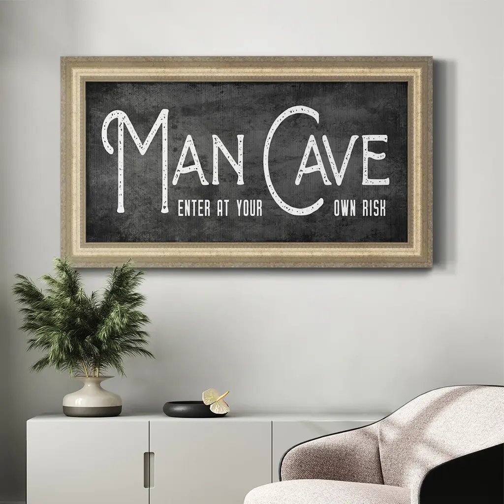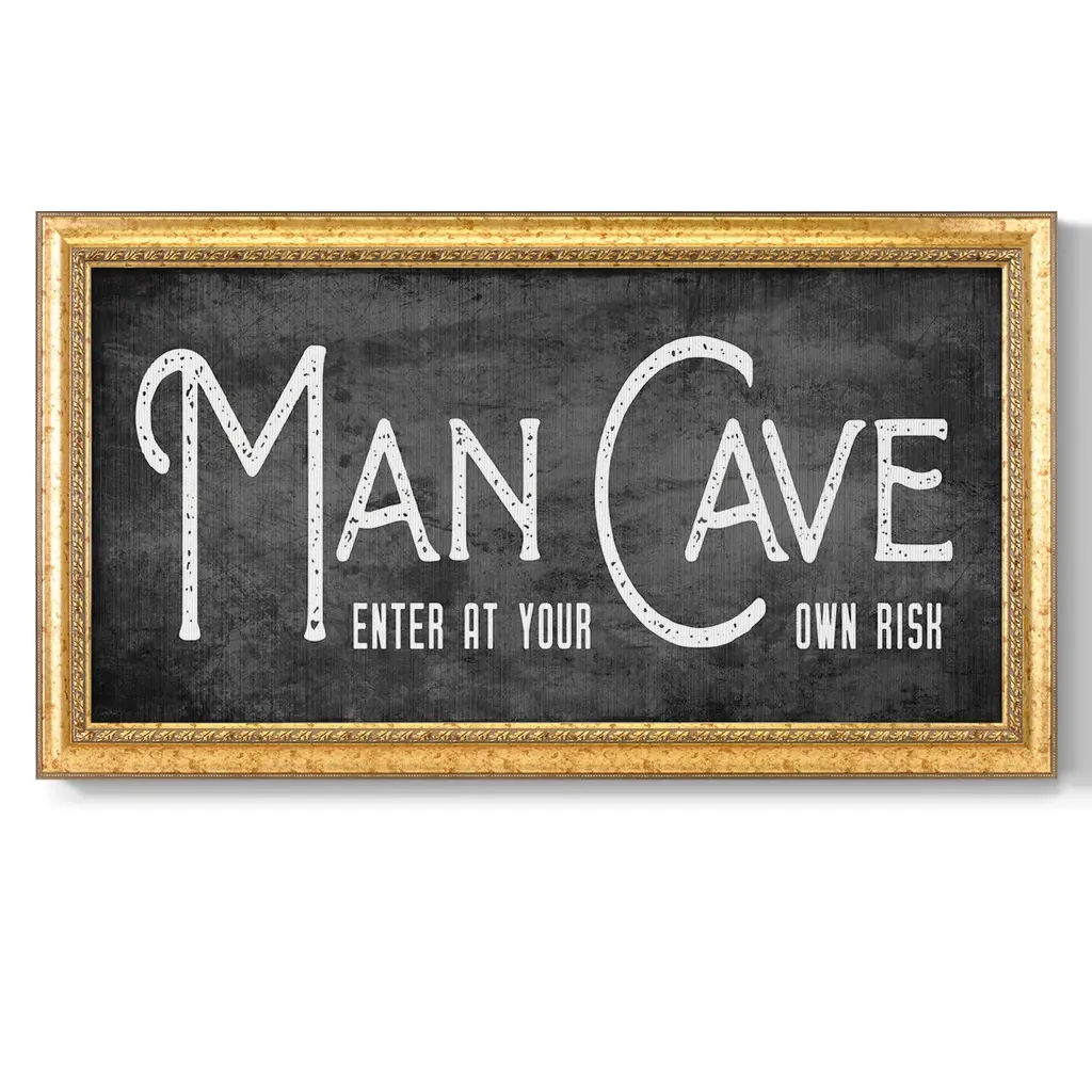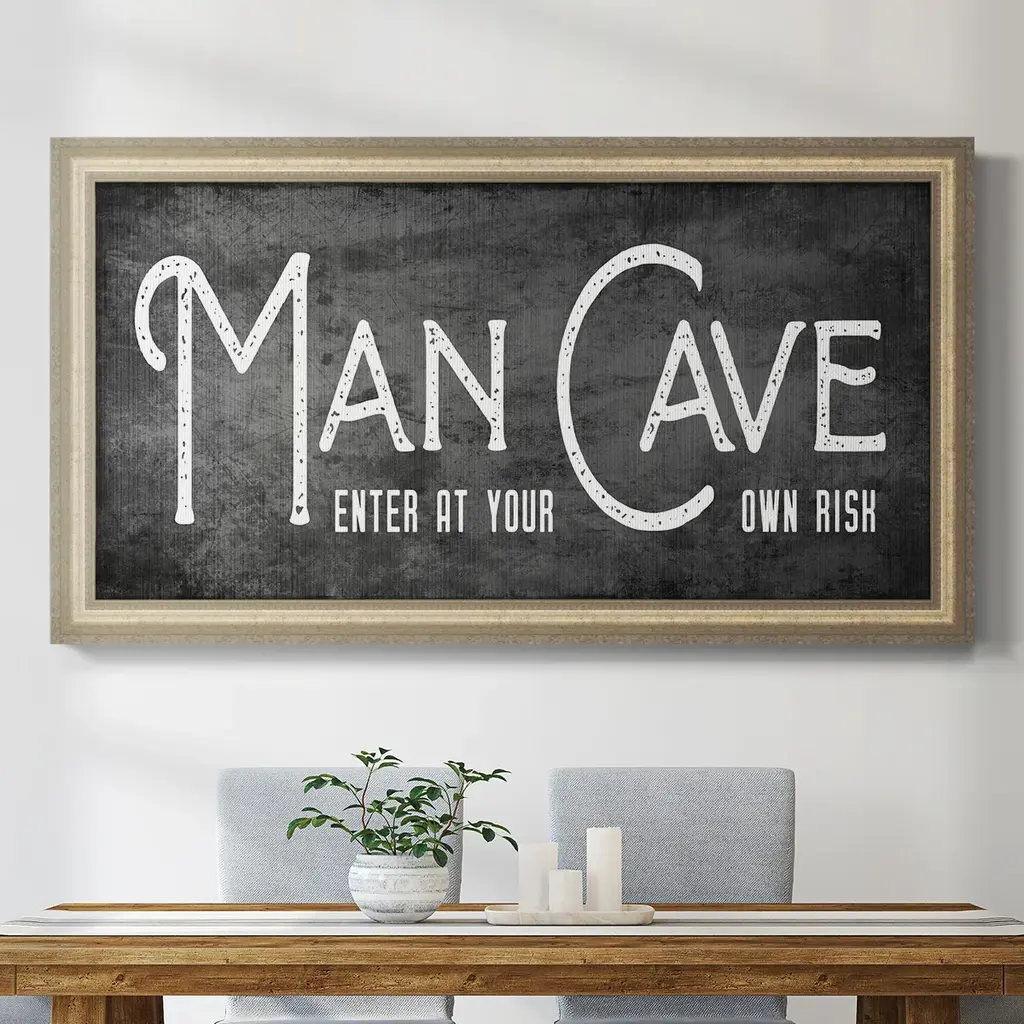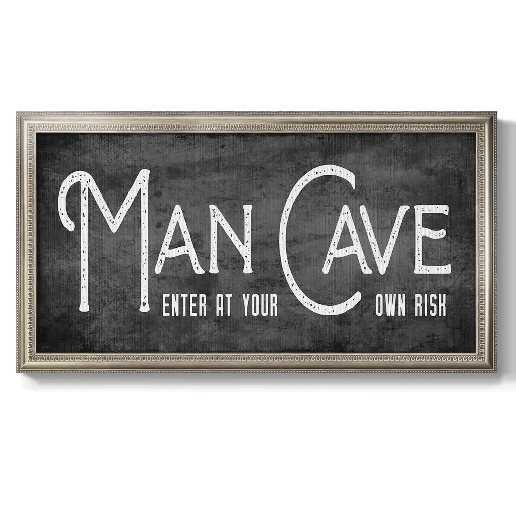 Man Cave Premium Framed Canvas- Ready to Hang A Premium Framed Canvas created to last. Framed in distressed wood and available in an array of sizes and colors Featuring a beveled a solid wood stretcher bar, each piece comes ready to hand 3 SIZES AVAILABLE 21''X37'' - Overall Size 25''X45'' - Overall Size 29''x53'' - Overall Size Each piece is made to order. Each piece comes with hanging hardware. Made in the USA Ready to Hang Giclee Paper Print Acrylic Glass Beveled Matt Board