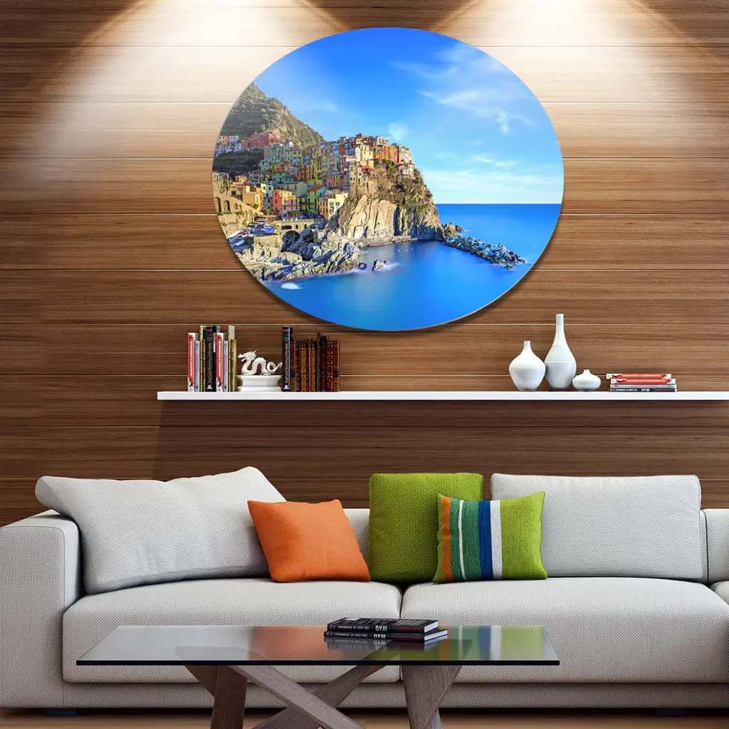 Bring Contemporary Abstraction to your home with this large Circle Metal wall art. This Manarola Village in Rocks and Sea Metal Artwork makes it the focal point of any room or office. - White Gloss Coating ensures colors are extra vibrant with light reflection.- Aluminum grade Sheet Metal with 1 inch mounting frame on the back giving the illusion that the artwork is floating on the wall..- Mounting Brackets are included along with instructions.- High Quality Digital images are created directly into a glossy aluminum panel producing a stunning and captivating print into the glossy finish of the metal.- Water, Fire and Scratch resistant HD Aluminum panels.- Looks better than any photo paper and guaranteed to last at least 20 years- Easy to clean with a microfiber cloth. Colors are far superior to regular Canvas Art. - Easy to Hang