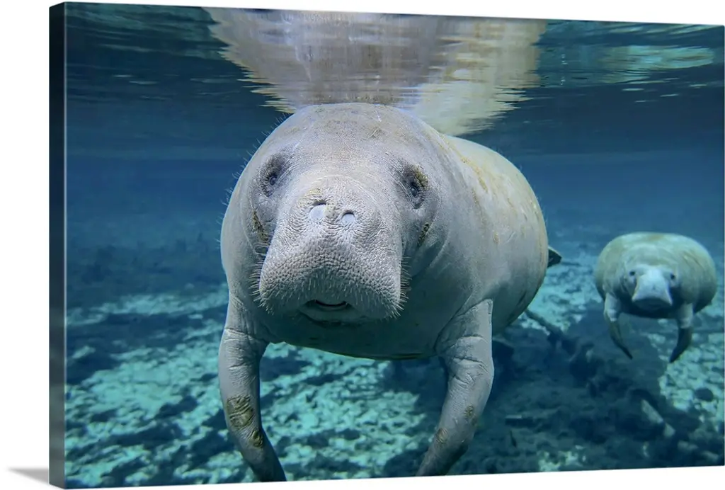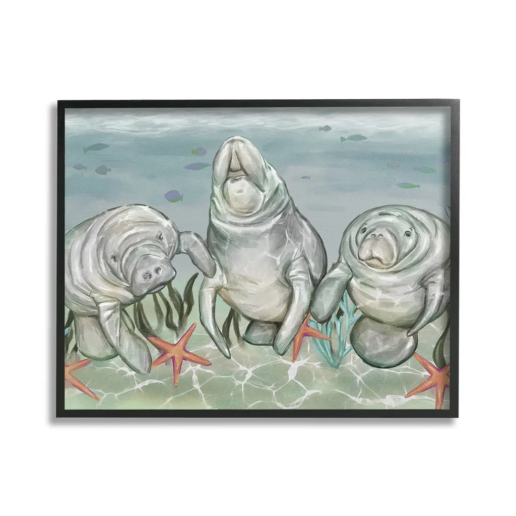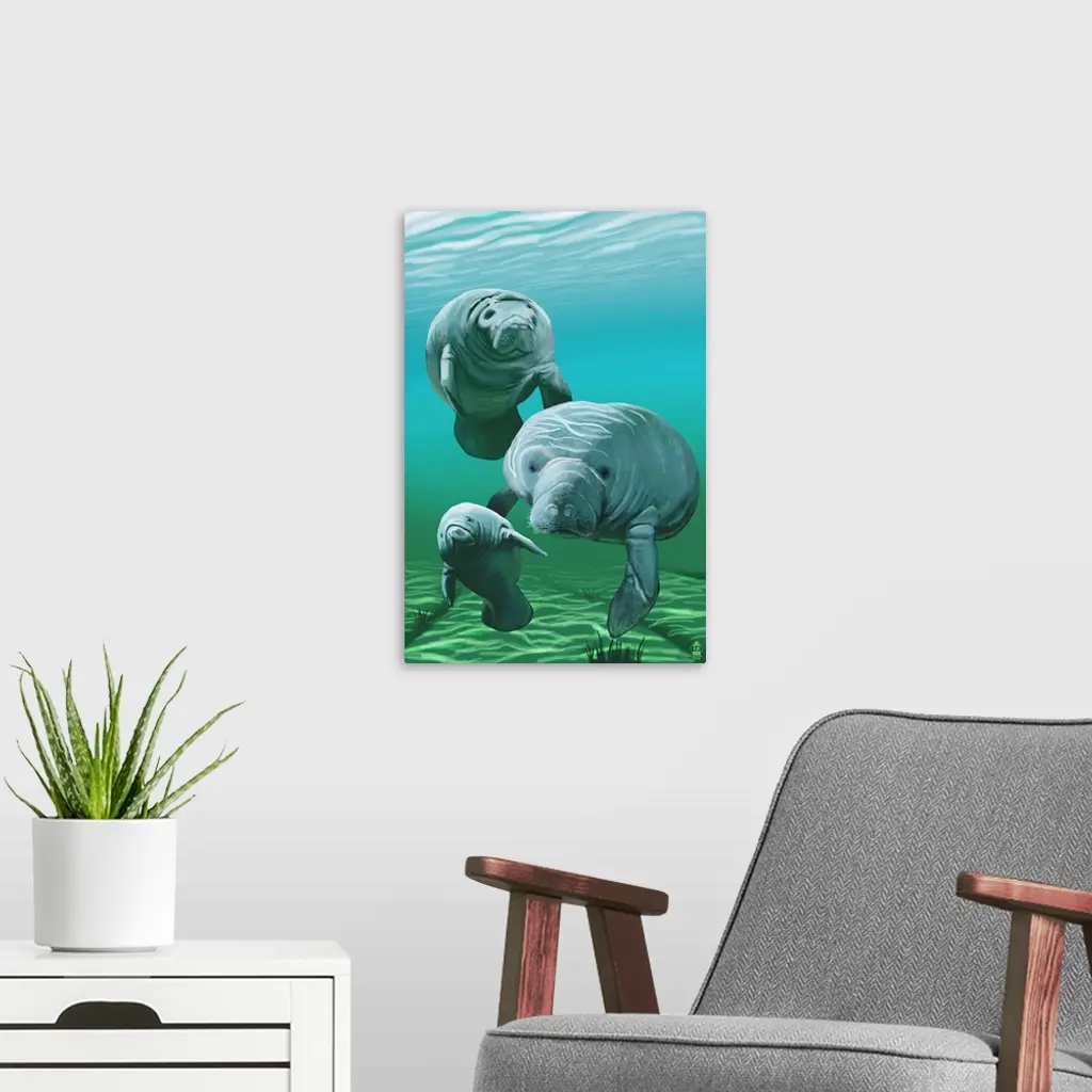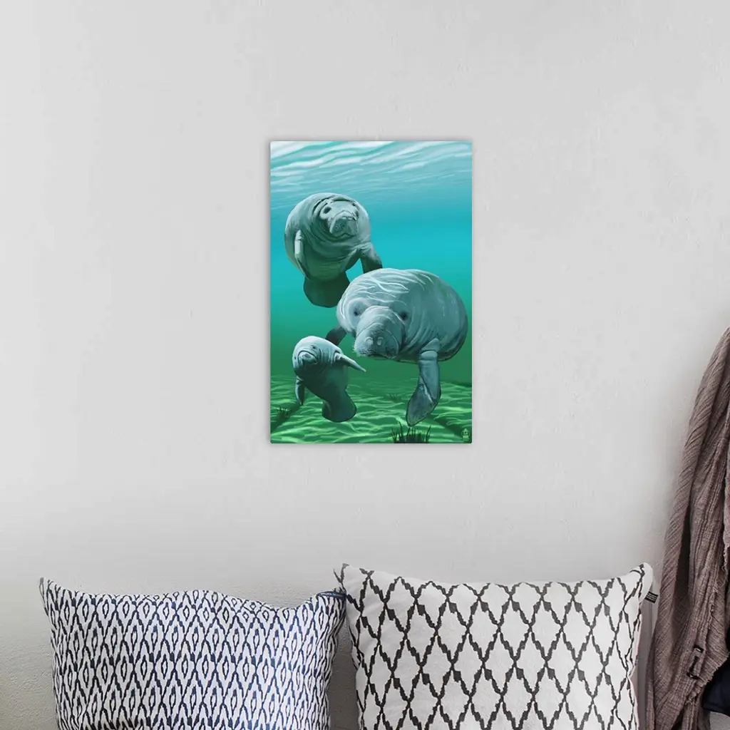 Retro stylized art poster of manatees floating in a gentle green sea.