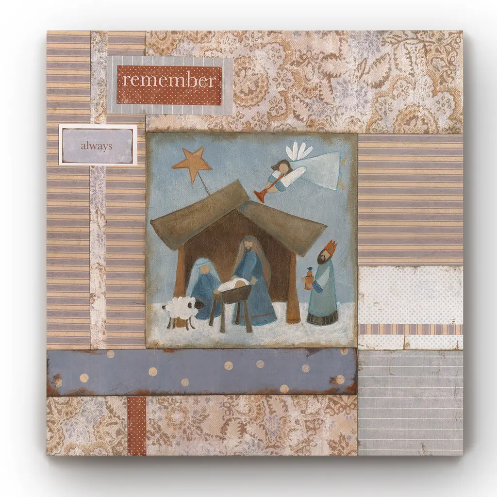 Manger Scene -Gallery Wrapped Canvas A premium hand strectched gallery wrapped canavas print created to last. Featuring a beveled a solid wood stretcher bar, each piece comes ready to hand 4 SIZES AVILABLE 10''X10'' - Overall Size 16''x16'' - Overall Size 24''x24'' - Overall Size 32''x32'' - Overall Size 40''x40'' - Overall Size Each piece is made to order. Built to Last Each piece comes ready to hang Solid wood strecher Fade and Water resitant Made domestically