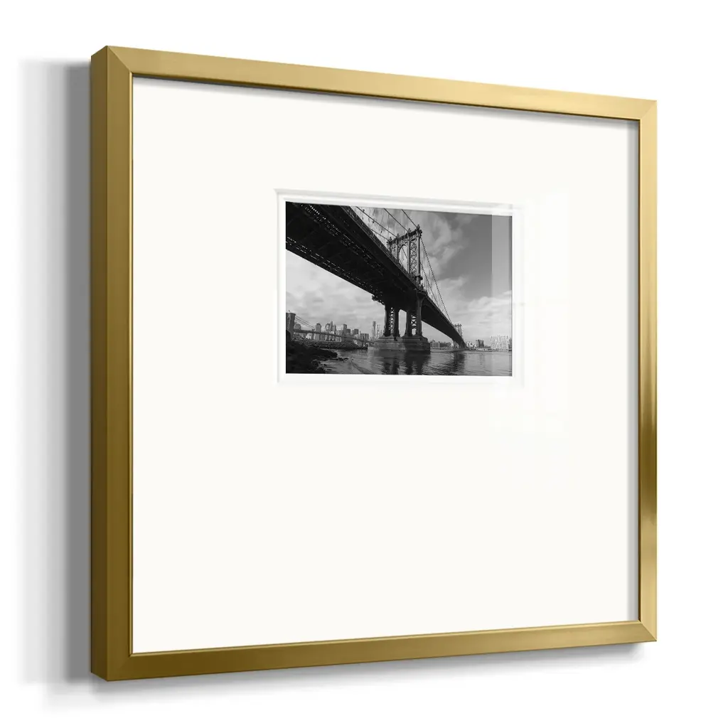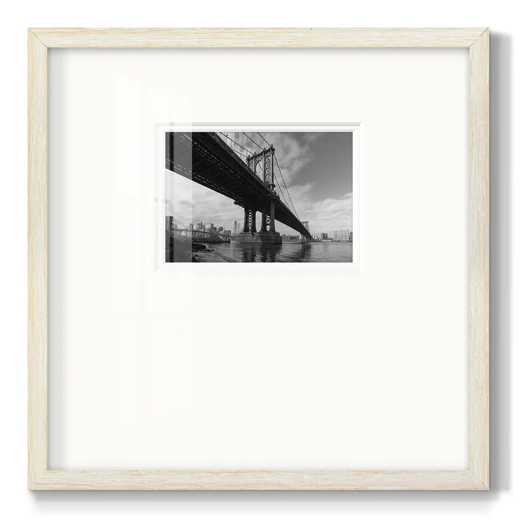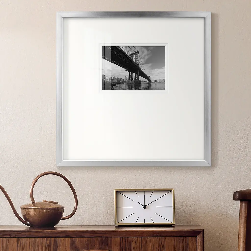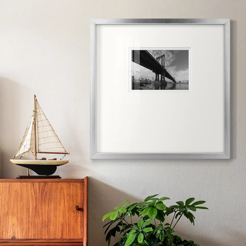 Manhattan BridgePremium Framed Print A framed cold pressed paper print featuring superior double matting and quality frame. 2 SIZES AVAILABLE 16''X16''' - Overall Size 20''X20''' - Overall Size Each piece is made to order. Each piece comes with hanging hardware. Made in the USA Ready to Hang Giclee Paper Print Plexiglass Beveled Matt Board Double Matte Board