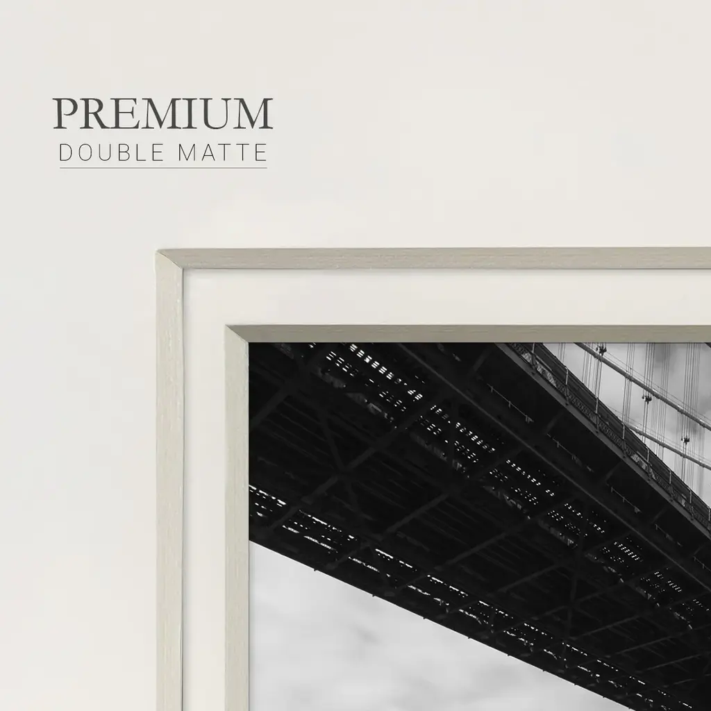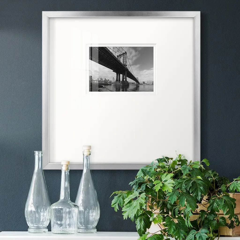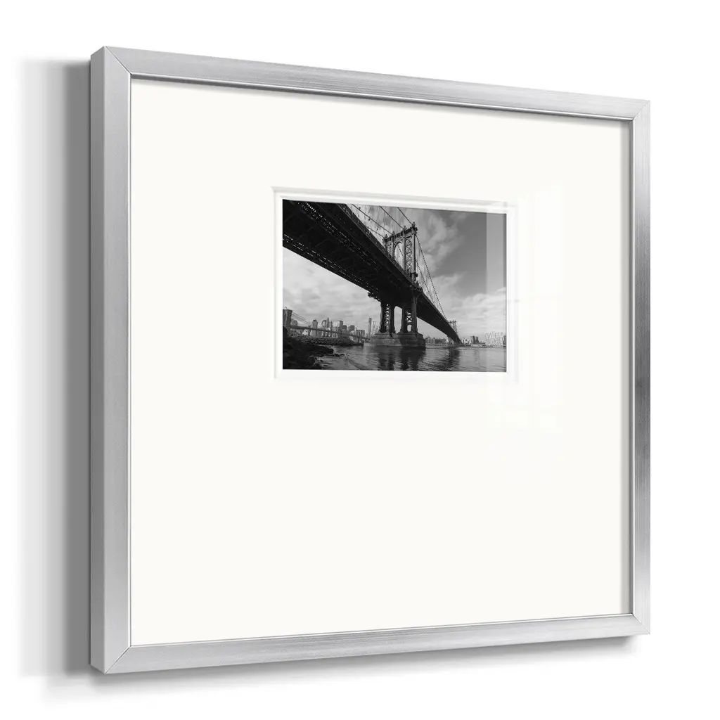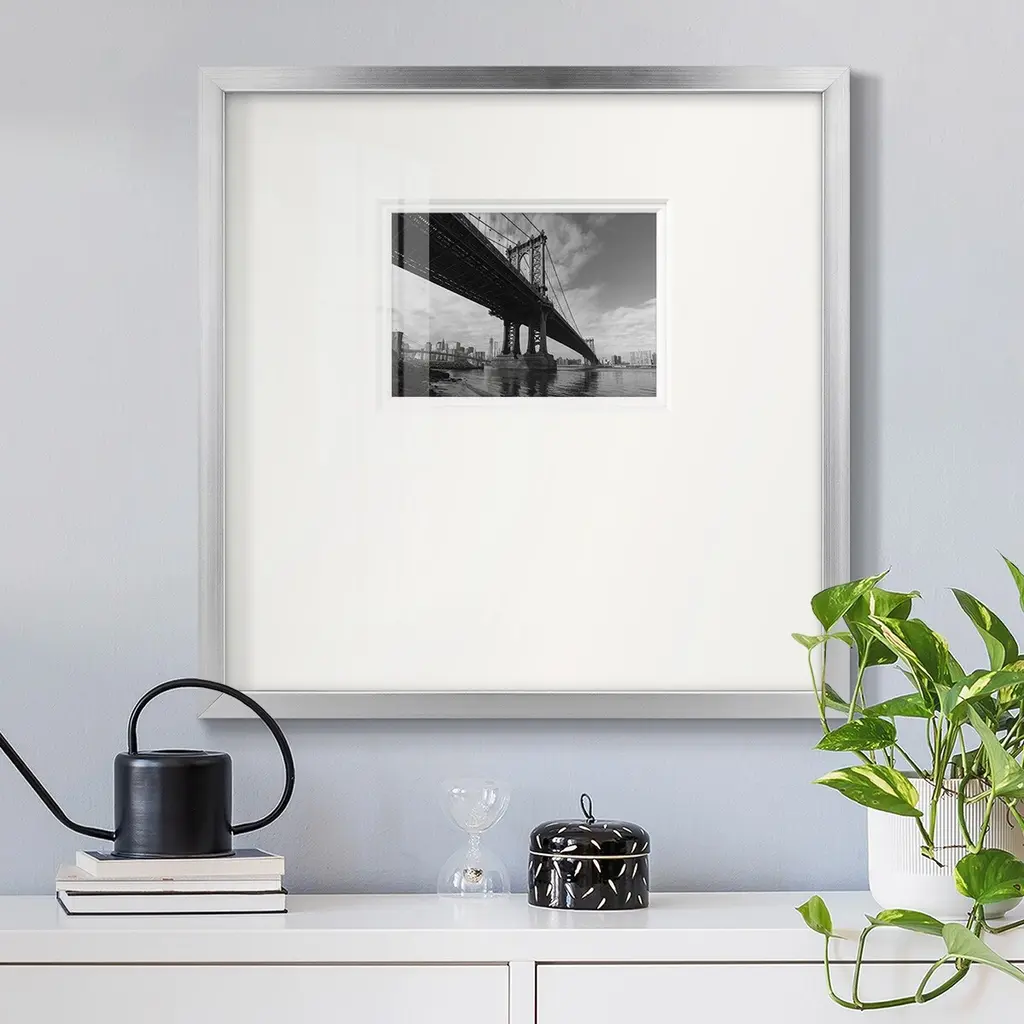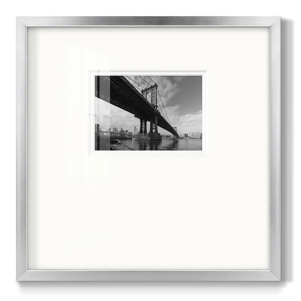 Manhattan BridgePremium Framed Print A framed cold pressed paper print featuring superior double matting and quality frame. 2 SIZES AVAILABLE 16''X16''' - Overall Size 20''X20''' - Overall Size Each piece is made to order. Each piece comes with hanging hardware. Made in the USA Ready to Hang Giclee Paper Print Plexiglass Beveled Matt Board Double Matte Board