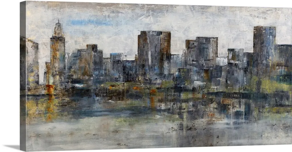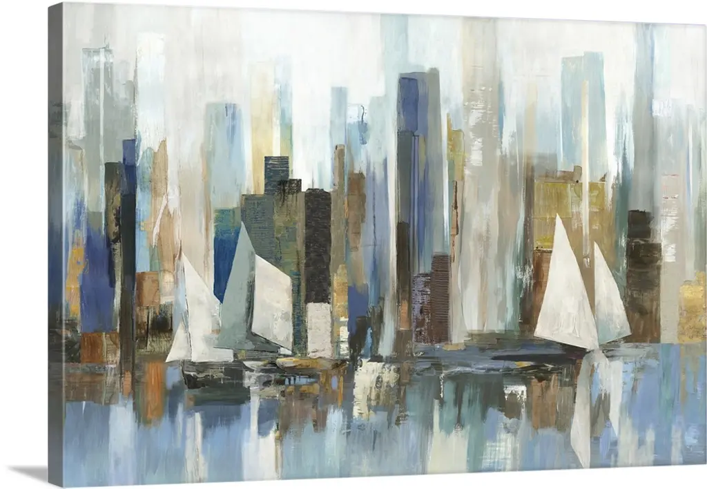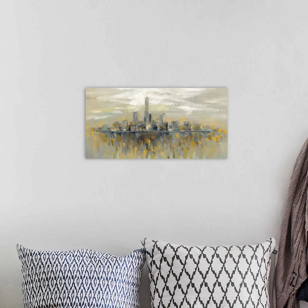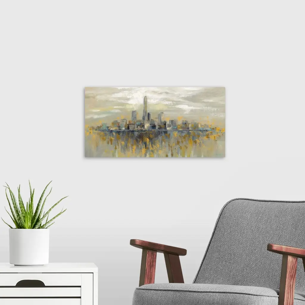 Contemporary landscape painting of the skyline of New York City with yellow accents.