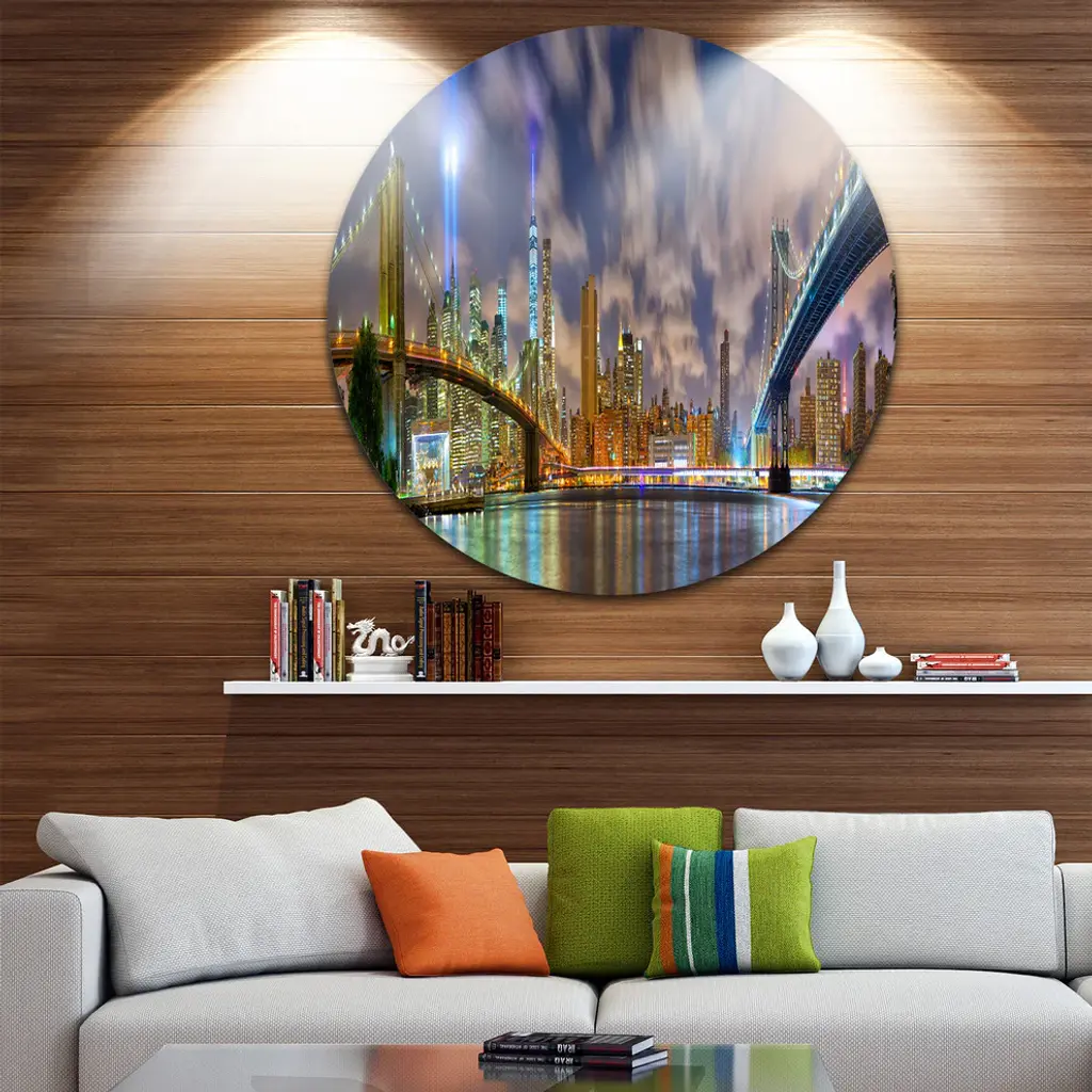 Bring Contemporary Abstraction to your home with this large Circle Metal wall art. This Manhattan in Memory of September 11 Metal Artwork makes it the focal point of any room or office. - White Gloss Coating ensures colors are extra vibrant with light reflection.- Aluminum grade Sheet Metal with 1 inch mounting frame on the back giving the illusion that the artwork is floating on the wall..- Mounting Brackets are included along with instructions.- High Quality Digital images are created directly into a glossy aluminum panel producing a stunning and captivating print into the glossy finish of the metal.- Water, Fire and Scratch resistant HD Aluminum panels.- Looks better than any photo paper and guaranteed to last at least 20 years- Easy to clean with a microfiber cloth. Colors are far superior to regular Canvas Art. - Easy to Hang