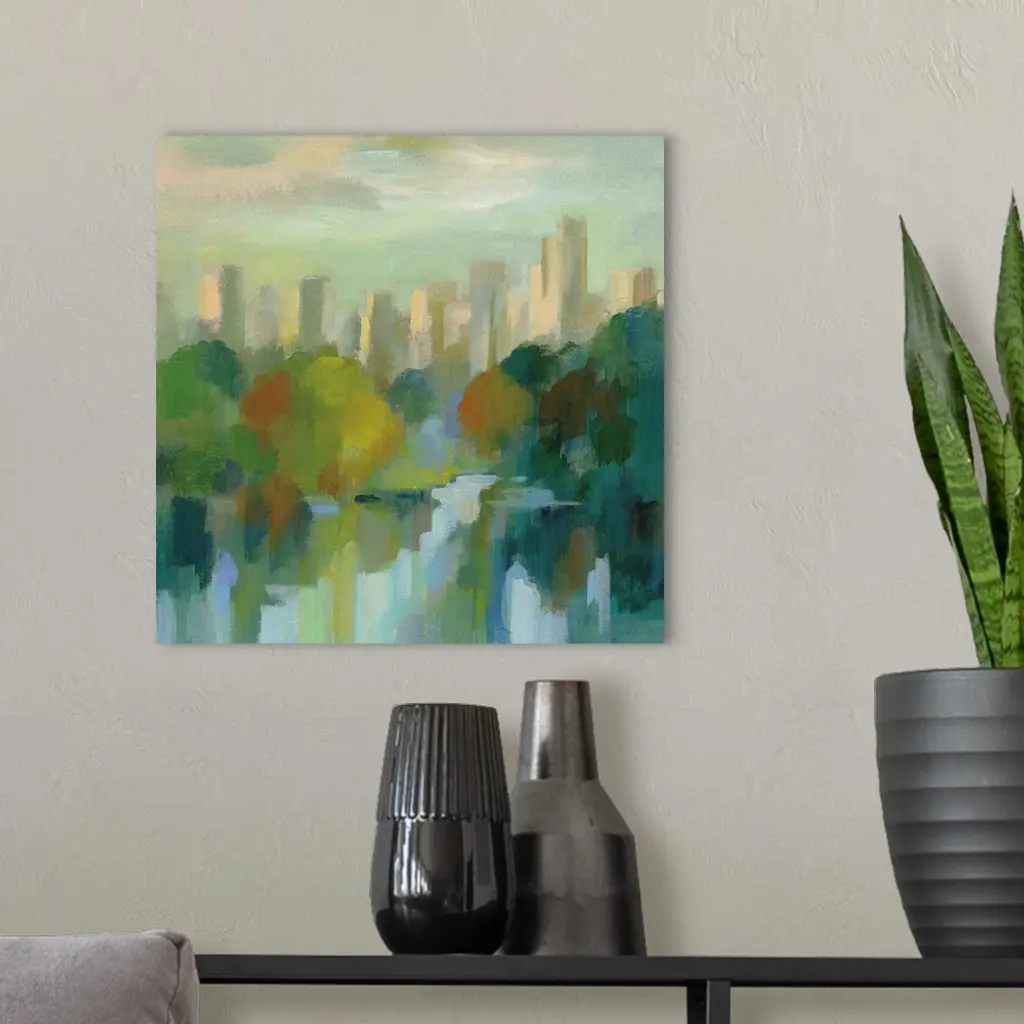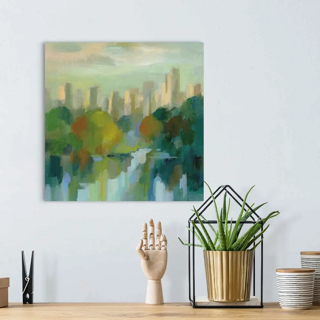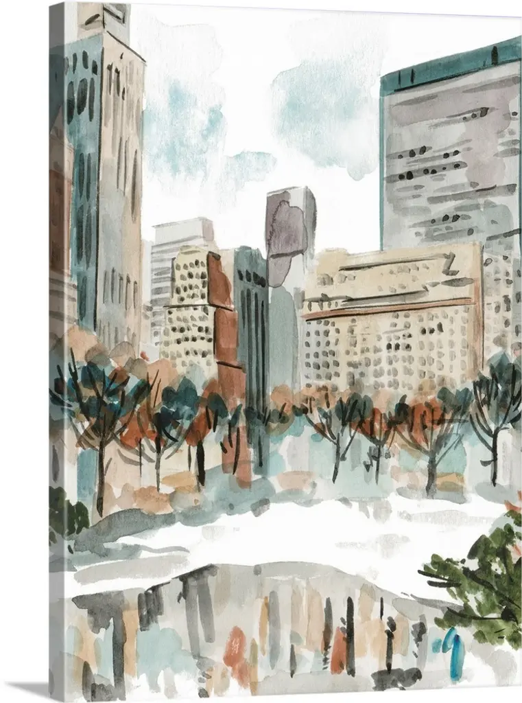 Contemporary artwork featuring impressionistic brushes of scenic view of Manhattan, New York.