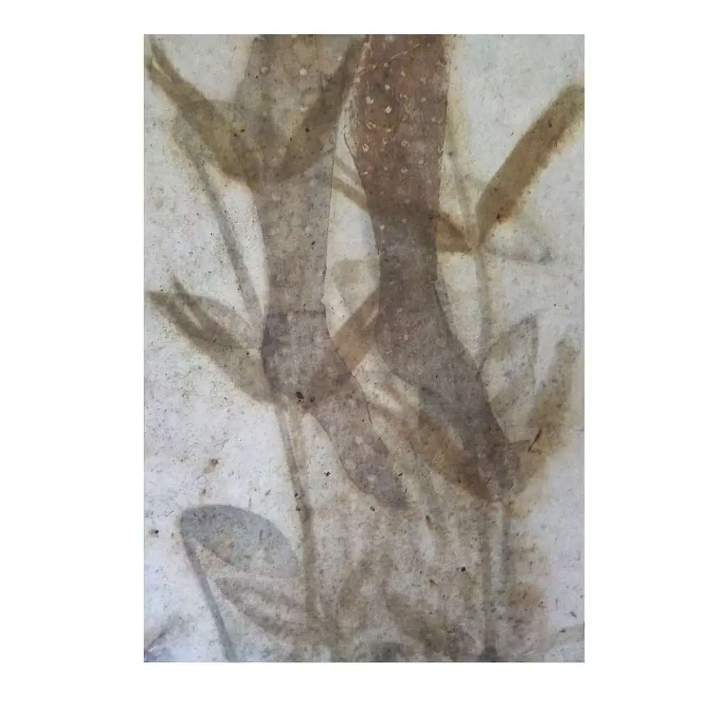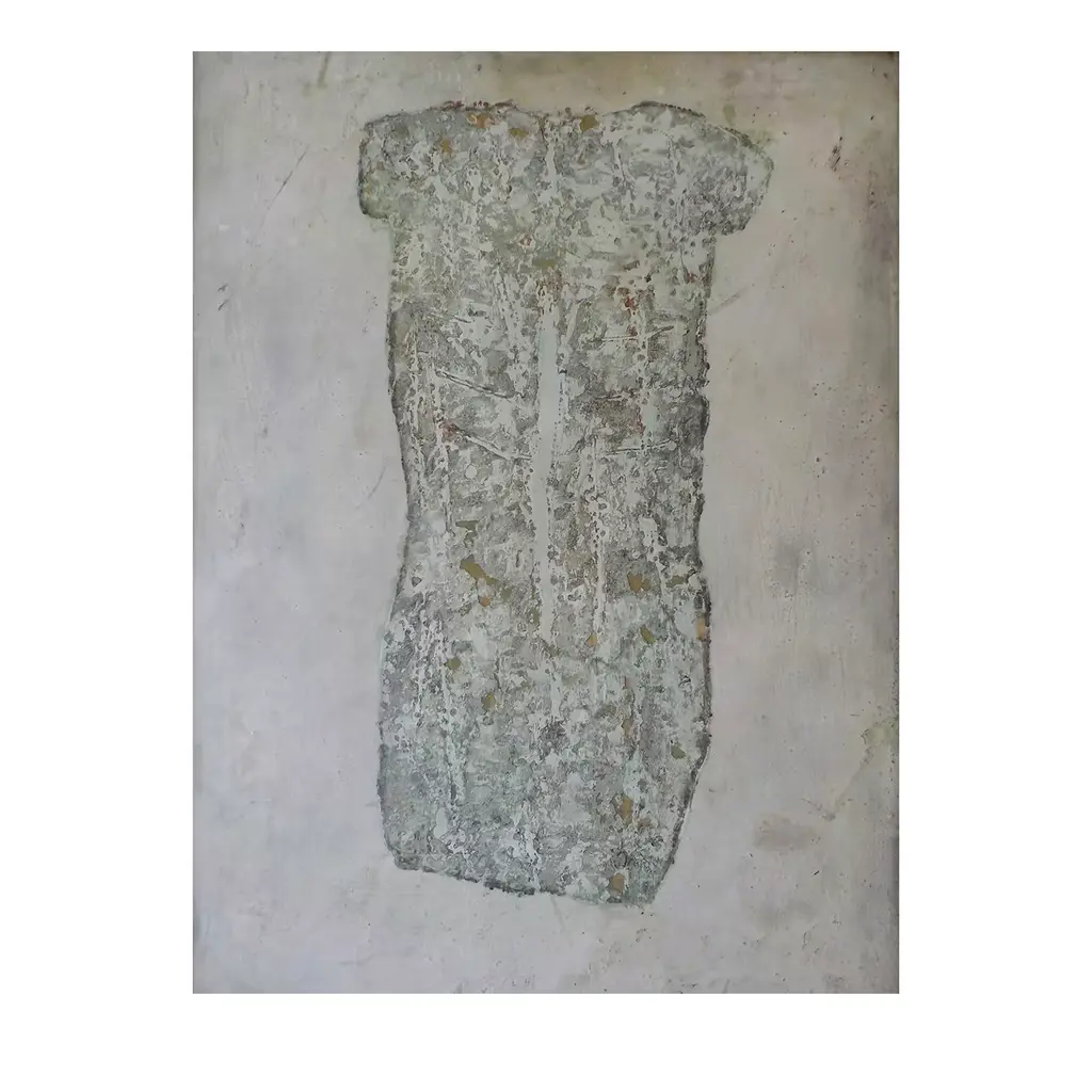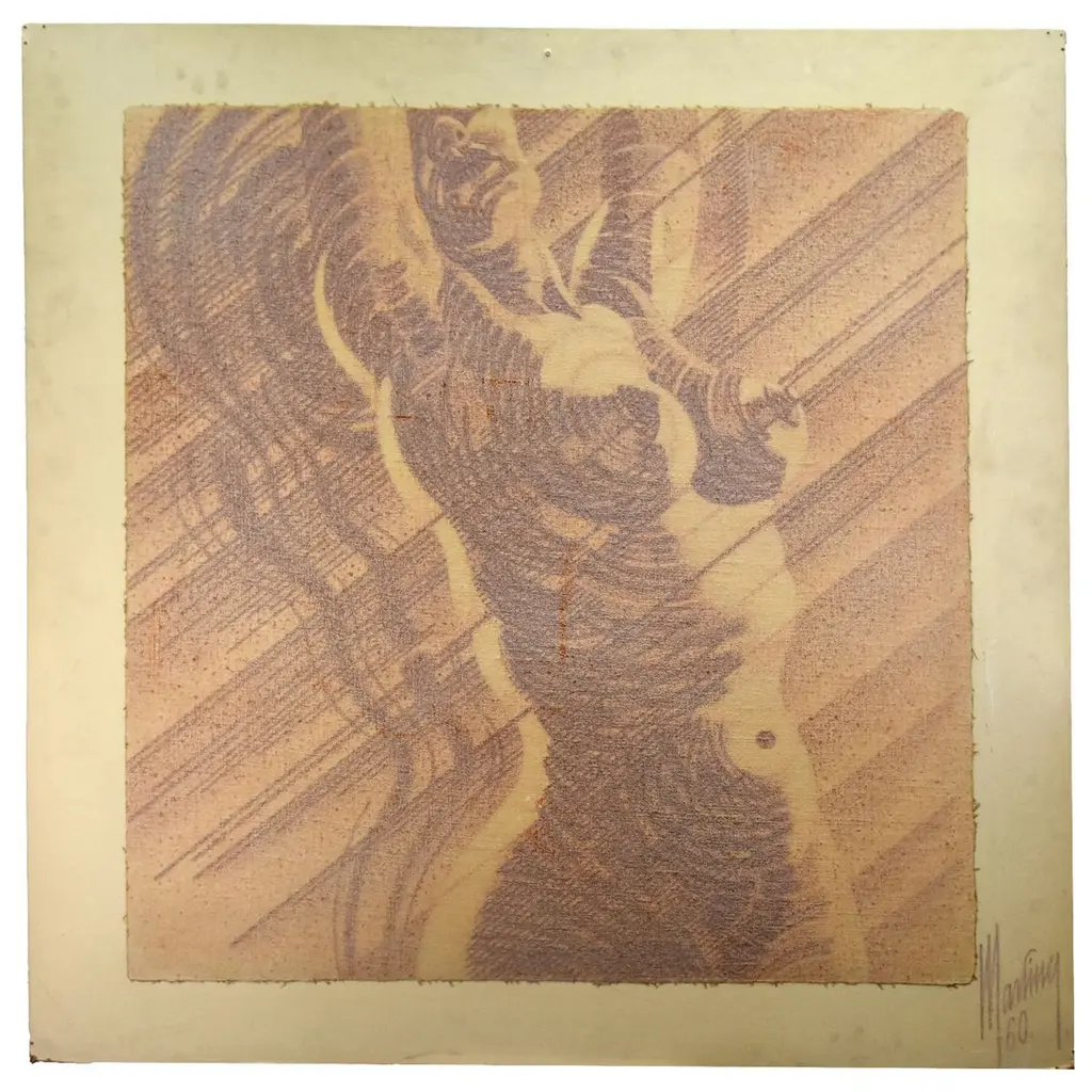 A sublime embodiment of Giusto Pilan's artistic research, focusing on recovering a lost memory originated from the birth of mankind, drawing inspiration from the first cave graffiti, this gorgeous painting is handmade with a particular technique based on marble dust, wax, and pigments fired into the paper surface, after using an intaglio press to create anthropomorphic and nature-inspired figures.